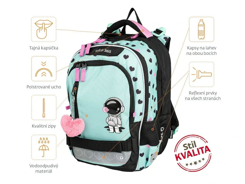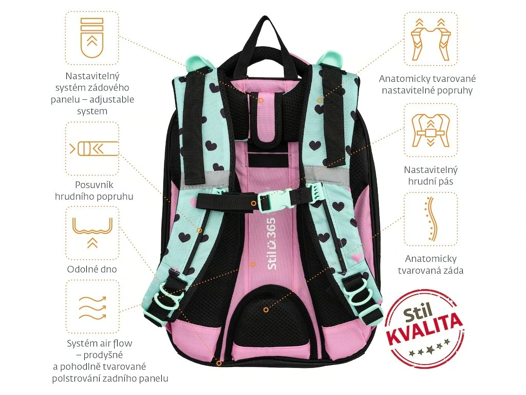Kvalitní, ergonomicky tvarovaný, odlehčený školní batoh je vybaven reflexními prvky a anatomicky tvarovanými zády s pevnou konstrukcí. Batoh je vhodný pro dítě s výškou 120 - 140 cm. Školní batohy Stil jsou certifikovány a ověřeny lékaři.