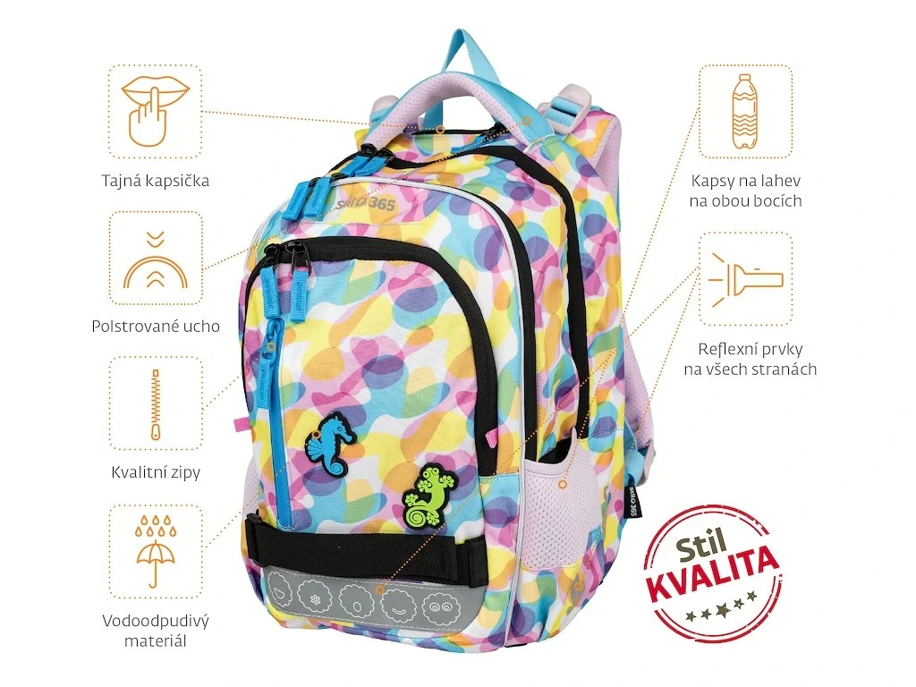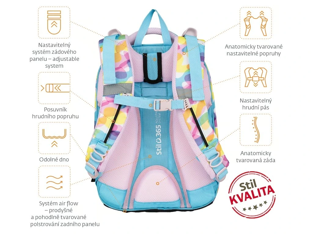 Kvalitní, ergonomicky tvarovaný, odlehčený školní batoh je vybaven reflexními prvky a anatomicky tvarovanými zády s pevnou konstrukcí. Batoh je vhodný pro dítě s výškou 120 - 140 cm. Školní batohy Stil jsou certifikovány a ověřeny lékaři.