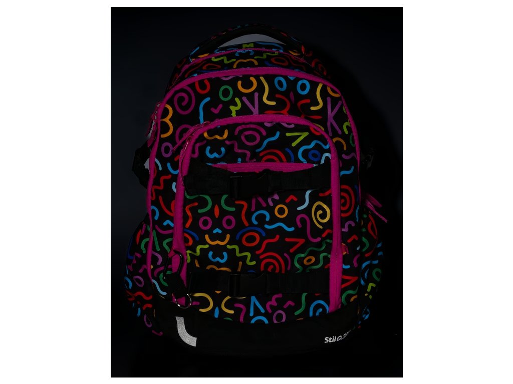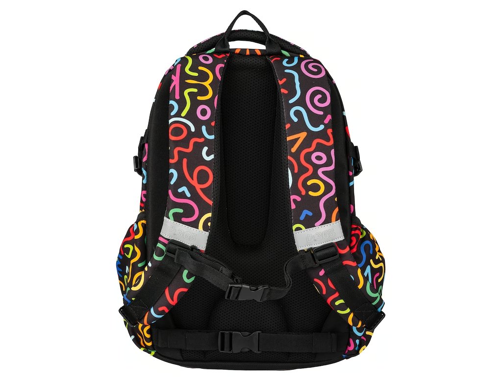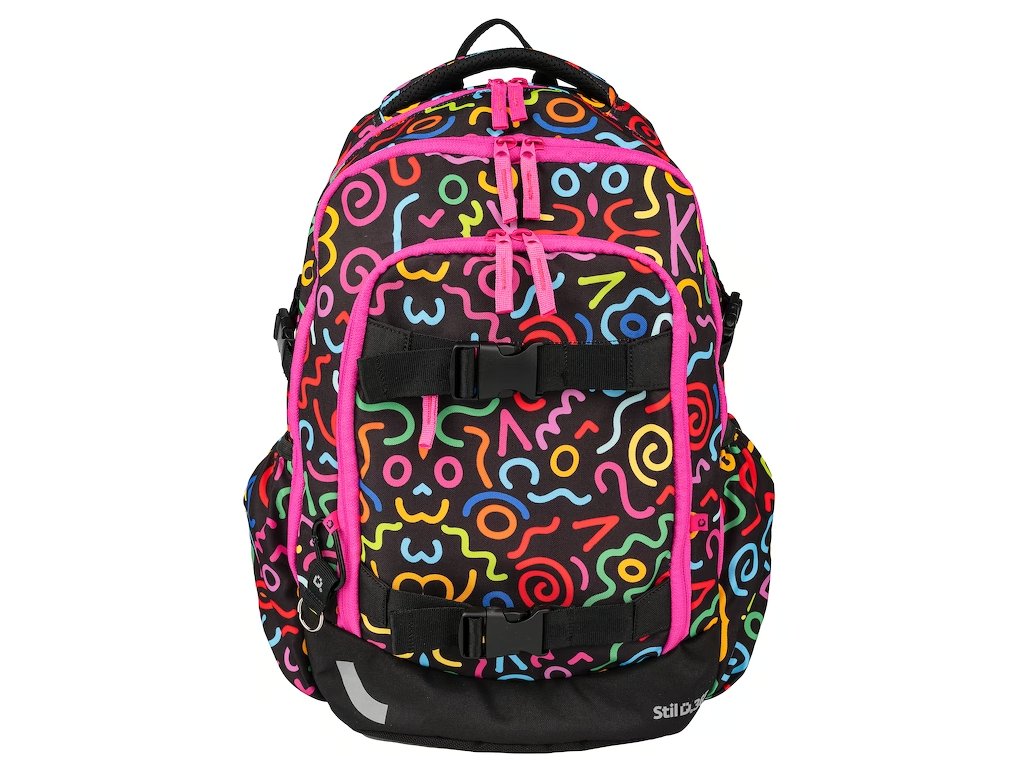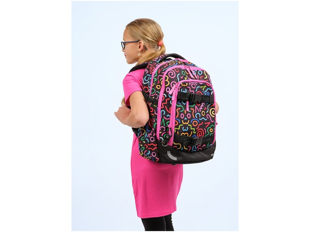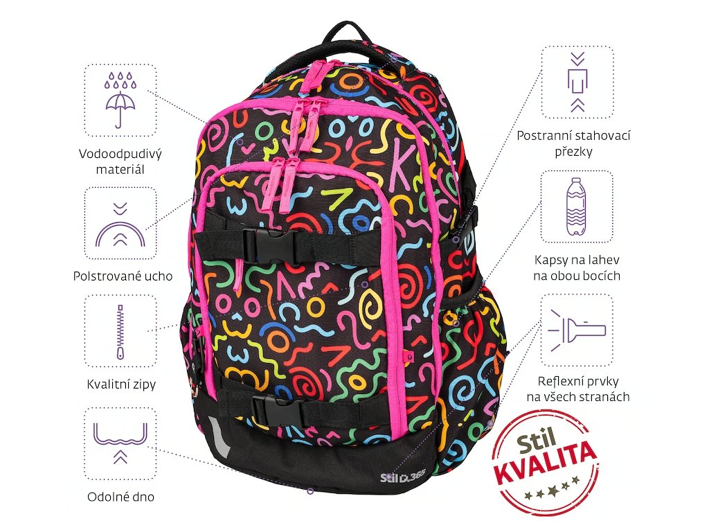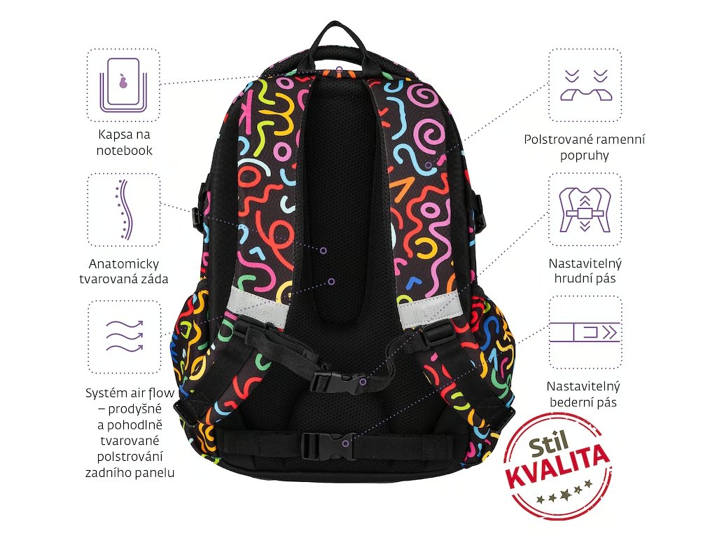 Tento model je perfektní volbou pro ty, kteří hledají kompromis mezi praktičností (tmavý podklad) a hravou energií, kterou děti milují. Barevné akcenty v podobě "circ" (kruhů či geometrických prvků) dodávají batohu moderní a dynamický vzhled.