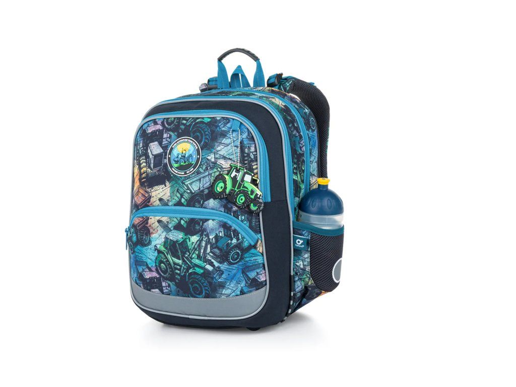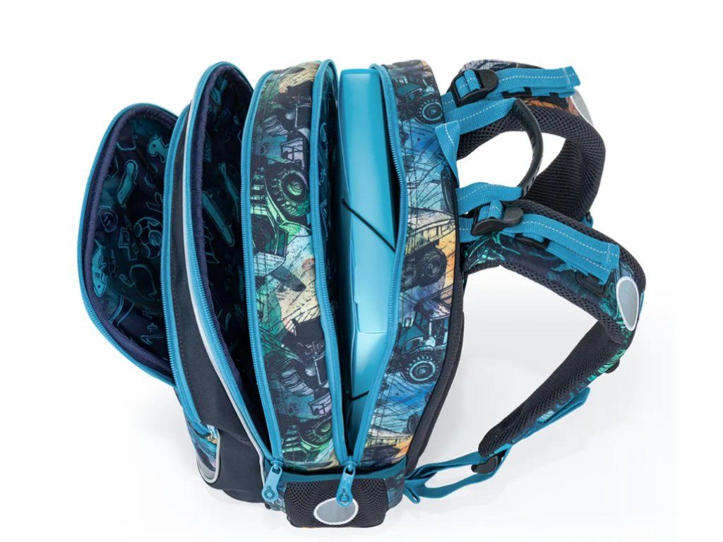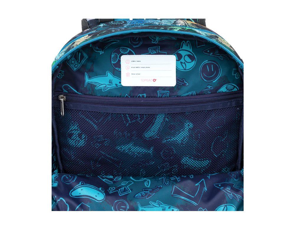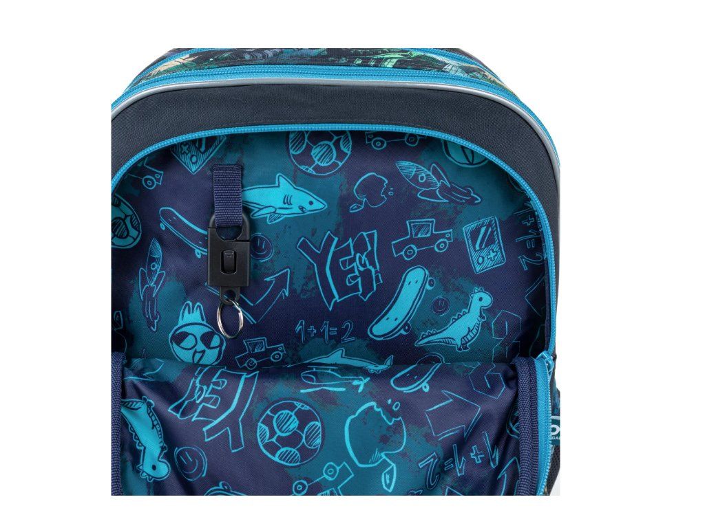 Uvnitř batohu najdete přehledně členěný prostor, ve kterém se malí školáci snadno zorientují. Hlavní komora pojme učebnice i desky na sešity, přední kapsa je ideální na penál, box na svačinu nebo lehčí školní výbavu. Do boční kapsy se pohodlně vejde lahev na pití o objemu 0,5 l Samozřejmostí je i odnímatelná karabina na klíče, aby se ty nejdůležitější drobnosti nikdy neztratily.