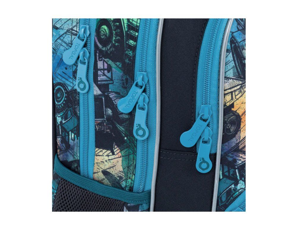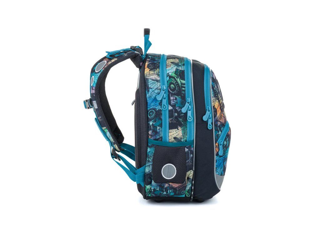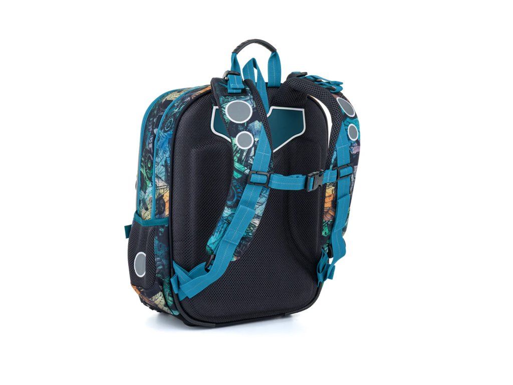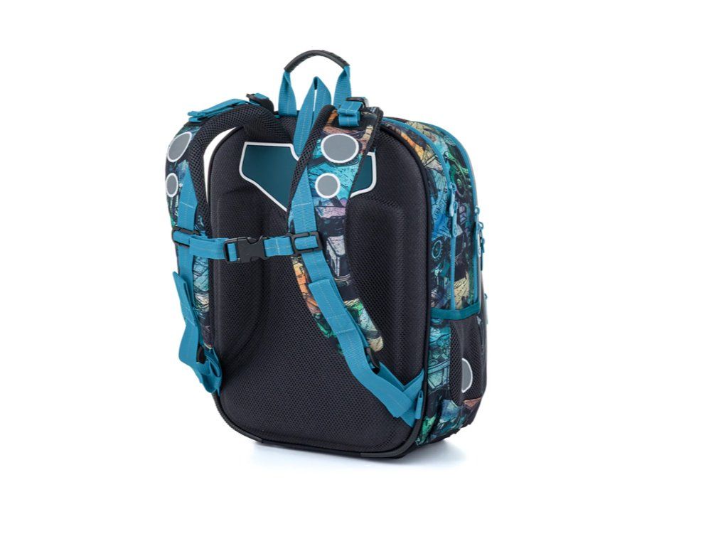 Školní batoh BAZI od značky Topgal vsadil na to nejdůležitější – správné rozložení zátěže na dětská záda. Pevná, ergonomicky tvarovaná zádová část je doplněna měkce polstrovanými ramenními popruhy, které se snadno přizpůsobí drobnější postavě. Výškově nastavitelná hrudní přezka udržuje batoh ve správné poloze a zabraňuje sjíždění popruhů z ramen. Výsledek? Pohodlné nošení i při plné náloži školních pomůcek.