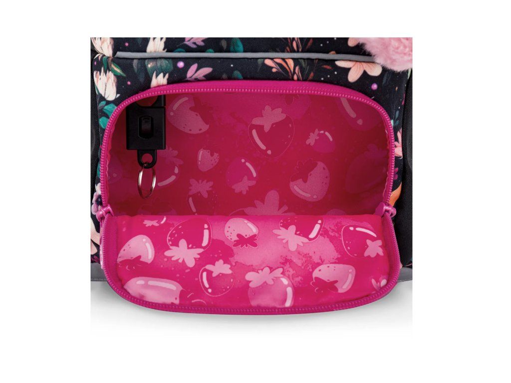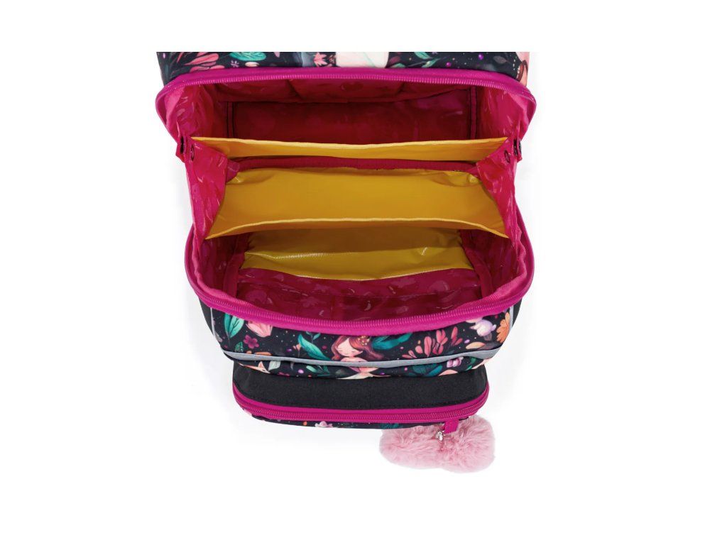 Uvnitř aktovky najdete jednu velkou komoru se žlutým nepropustným organizérem, který pomůže malé školačce udržet pořádek bez zbytečného přemýšlení. Na přední části aktovky jsou dvě praktické kapsičky na zip včetně jmenovky – pro ty nejdůležitější drobnosti vždy přesně k nalezení. Nechybí ani odnímatelná karabina na klíče a praktické poutko na zavěšení aktovky na lavici ve třídě.