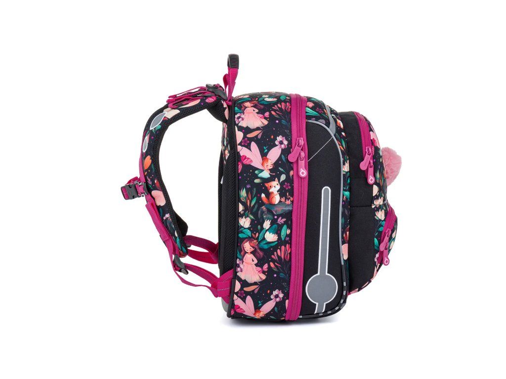 Ergonomicky řešená záda jsou doplněna měkce polstrovanými ramenními popruhy, které se snadno přizpůsobí i drobnější postavě dítěte od 110 cm. Výškově nastavitelná hrudní přezka udrží aktovku ve správné poloze a zabrání nepříjemnému sjíždění popruhů z ramen. Chcete ještě lepší rozložení zátěže? Stačí připojit bederní pás (TOP 24021 / TOP 24022, prodávaný samostatně). Drobným, ale praktickým detailem jsou magnetky na koncích ramenních popruhů, které zabrání vlání volných konců do stran.