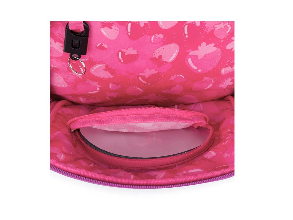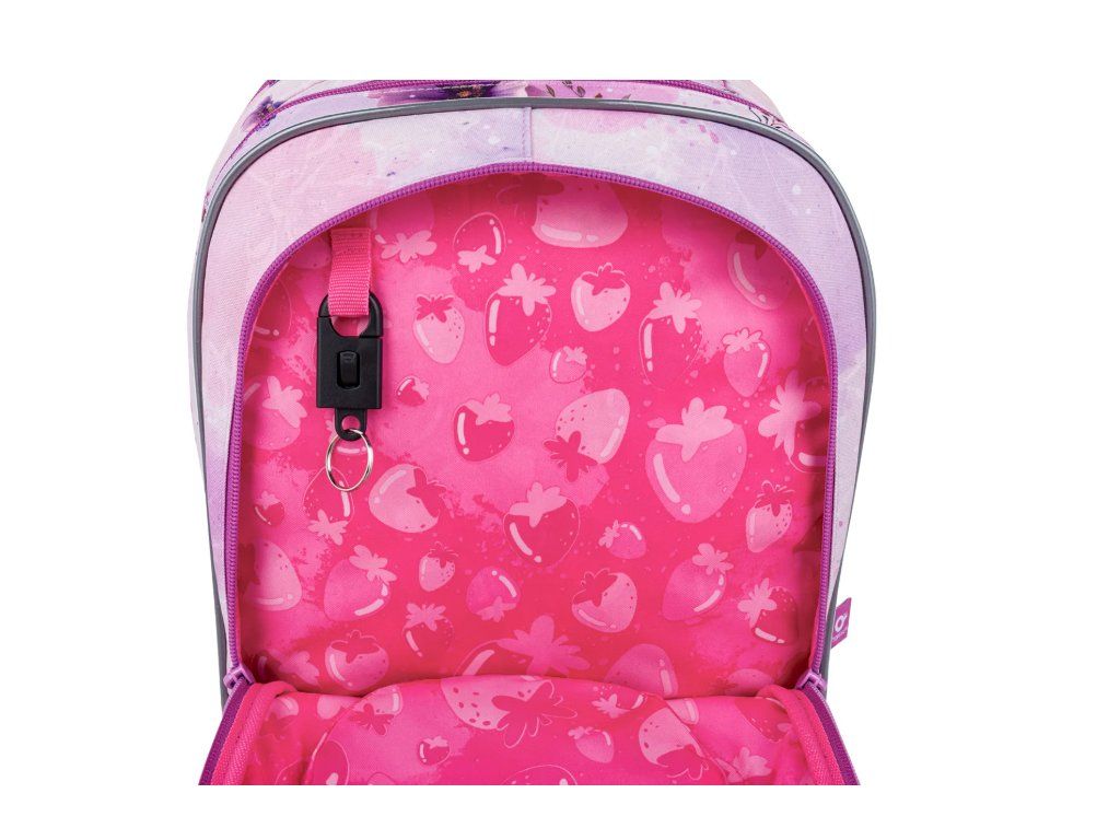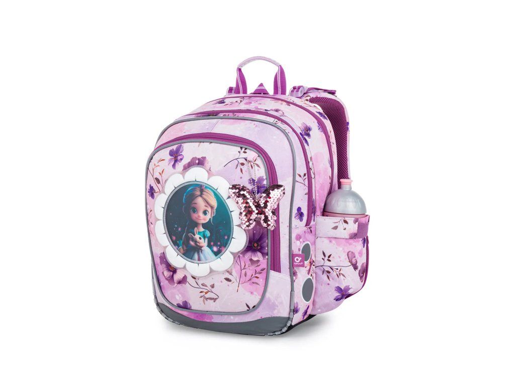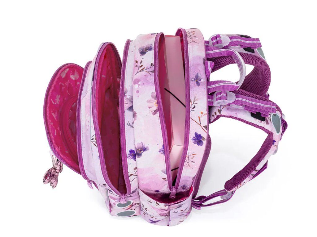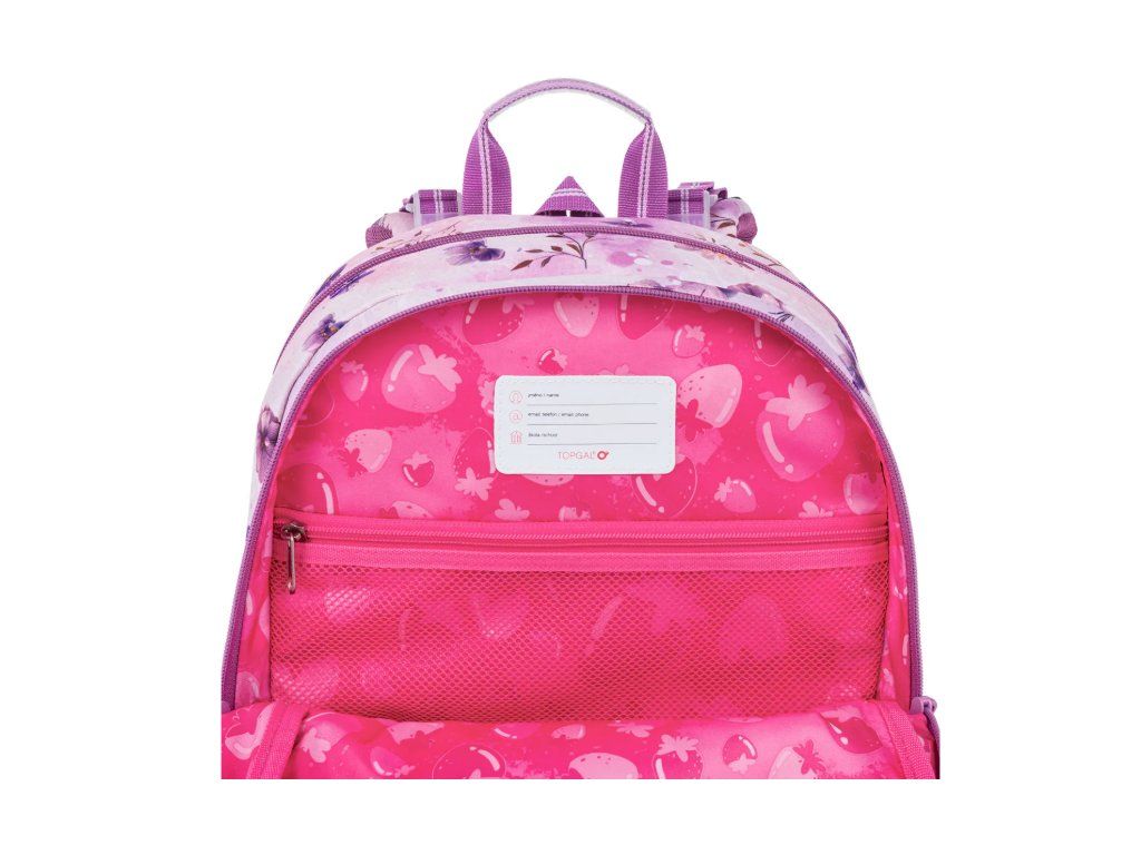 Batoh ENDY nabízí praktické dvoukomorové uspořádání, které malým školačkám pomáhá udržet pořádek bez velkého přemýšlení. Zadní, prostornější komora je ideální pro těžší učebnice a desky na sešity, přední užší komora pak spolehlivě pojme penál, box na svačinu nebo lehčí školní výbavu. Uvnitř nechybí ani síťovaná kapsa na drobnosti. Přední kapsa je vybavena odnímatelnou karabinou na klíče a do boční kapsy se pohodlně vejde lahev na pití o objemu 0,5 l – doporučujeme lahev Topgal ZIVA.
