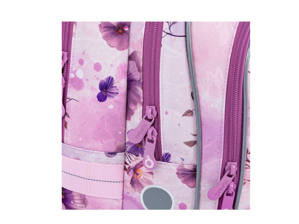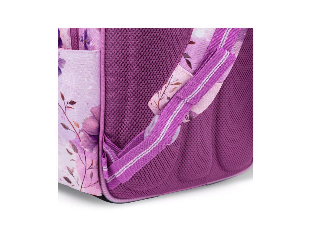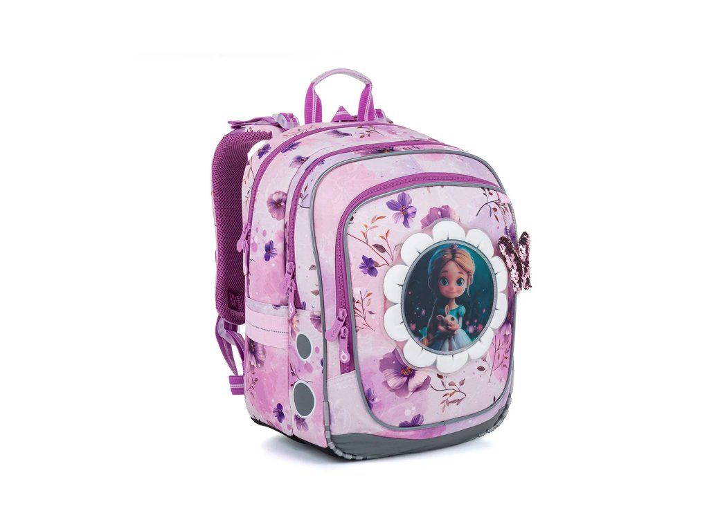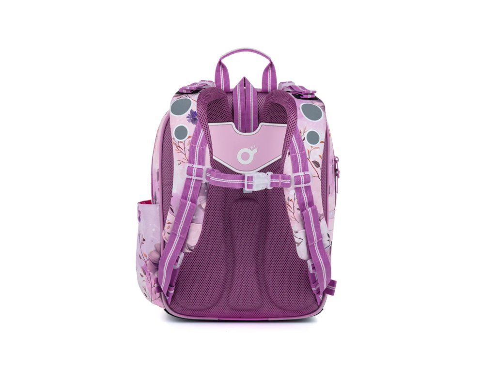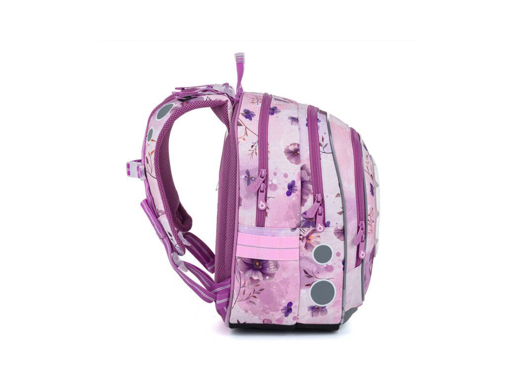 Batoh ENDY nabízí praktické dvoukomorové uspořádání, které malým školačkám pomáhá udržet pořádek bez velkého přemýšlení. Zadní, prostornější komora je ideální pro těžší učebnice a desky na sešity, přední užší komora pak spolehlivě pojme penál, box na svačinu nebo lehčí školní výbavu. Uvnitř nechybí ani síťovaná kapsa na drobnosti. Přední kapsa je vybavena odnímatelnou karabinou na klíče a do boční kapsy se pohodlně vejde lahev na pití o objemu 0,5 l – doporučujeme lahev Topgal ZIVA.