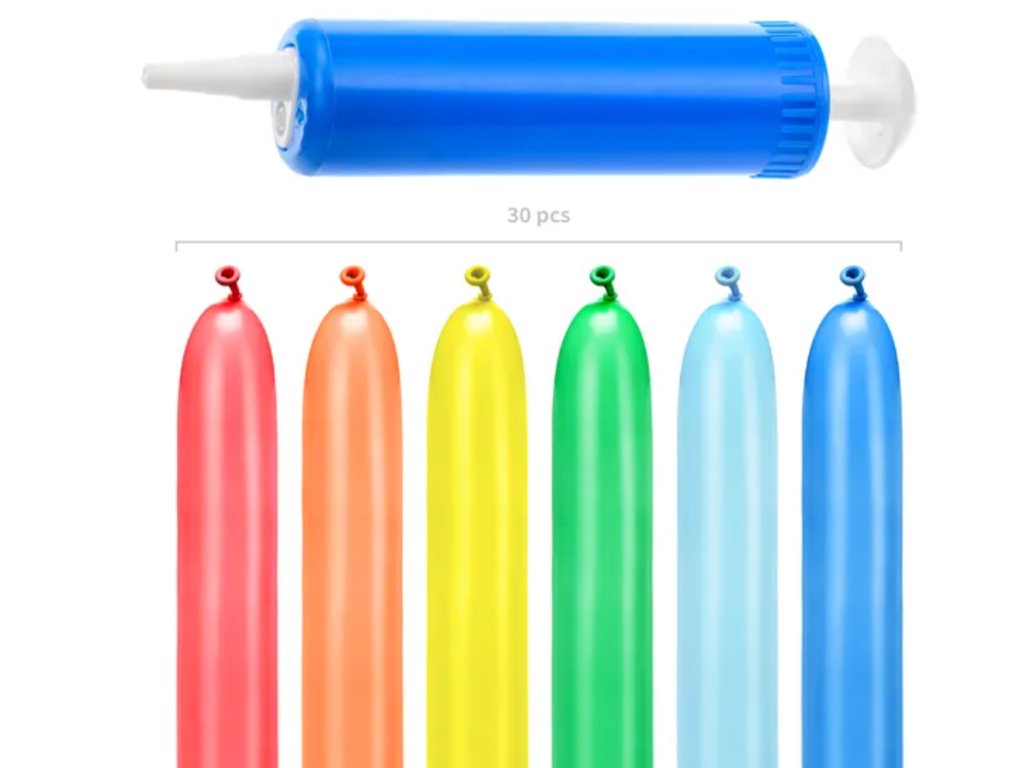 Modelování pastelových balónků s pumpičkou, směs barev: oranžová, tmavě modrá, červená, žlutá, lila, světle modrá, zelená. Velikost přibližně 5 x 130 cm. (1 balení / 30 ks)