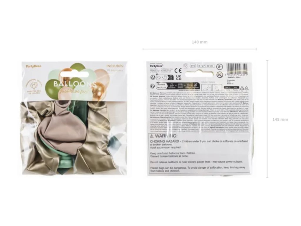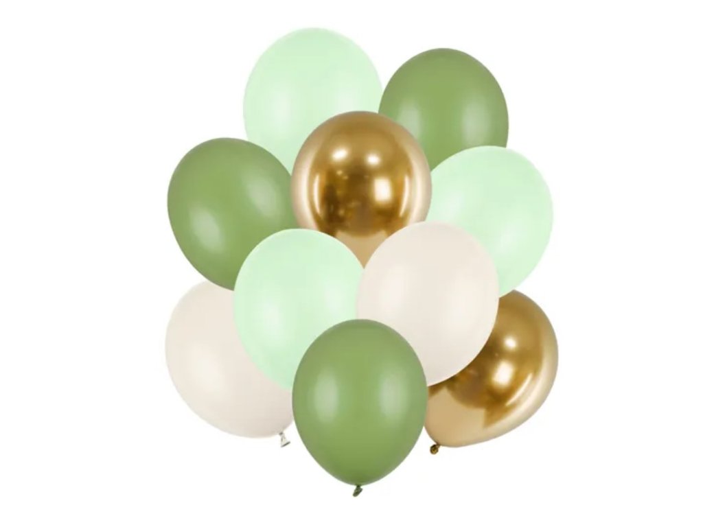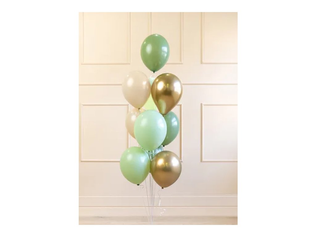 Sada latexových balónků, mix barev (pastelové pistácie - 3 ks, pastelové rozmarýny - 3 ks, pastelové alabastrové - 2 ks a lesklé zlaté - 2 ks), sada obsahuje balónky o velikosti 27 cm a 30 cm.