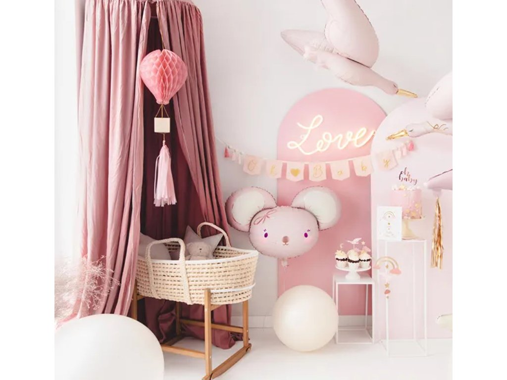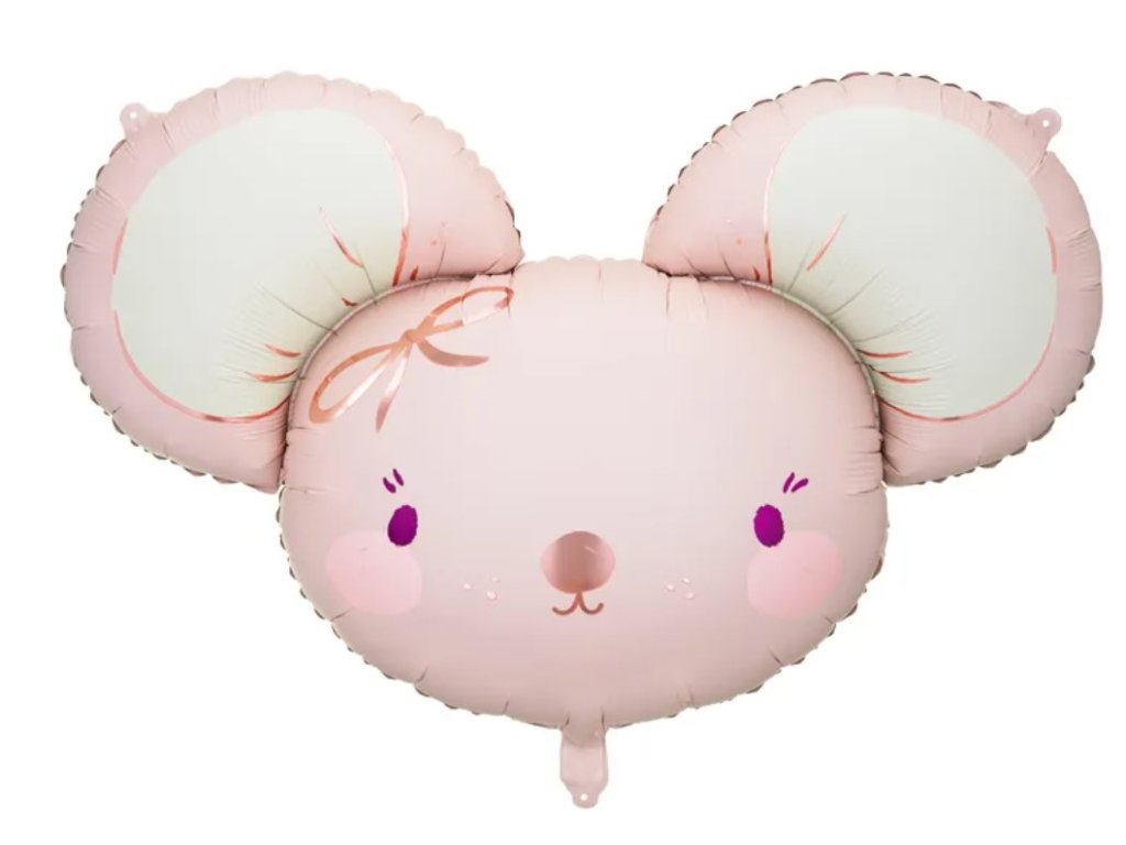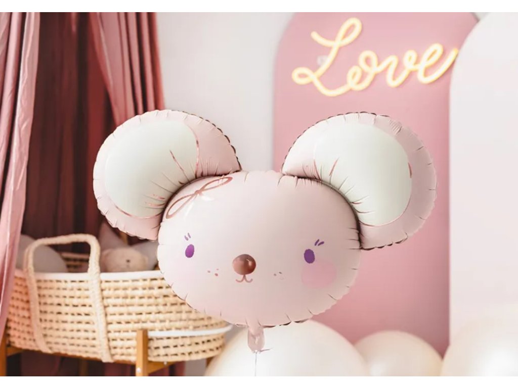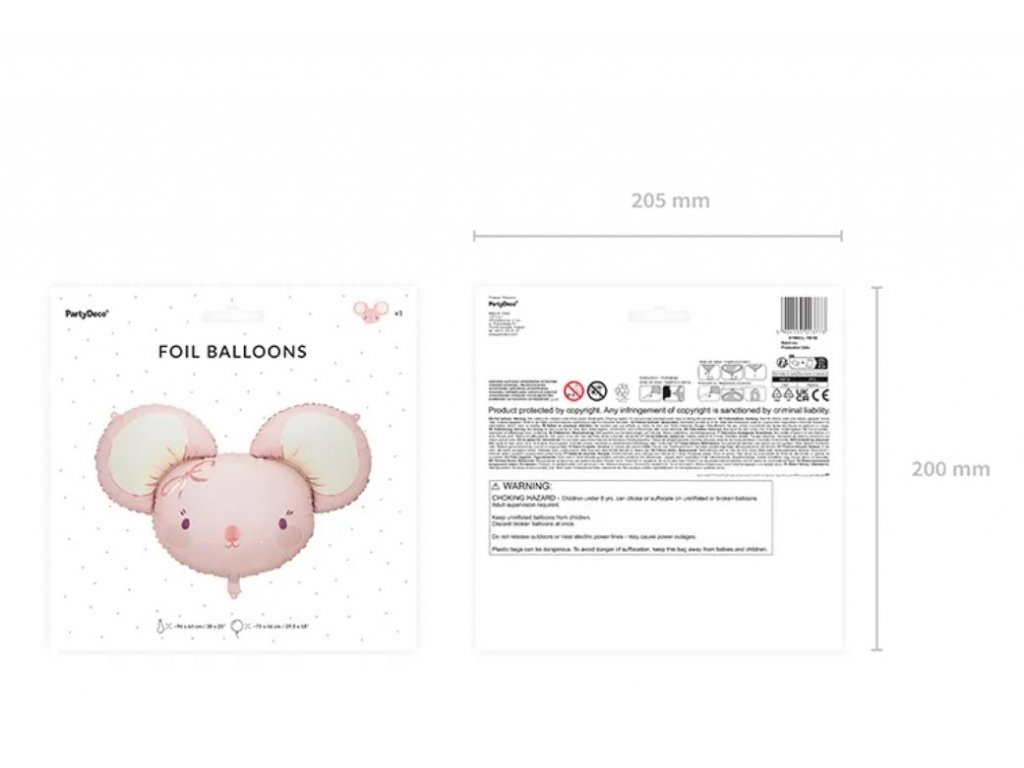 Fóliový balónek Myš ve světle růžové barvě, velikost před nafouknutím cca. 96 x 64 cm (38 x 25''), wymiary po napompowaniu v pořádku. 75 x 46 cm (29,5 x 18''). Nafoukněte vzduchem a heliem. Sada obsahuje brčko