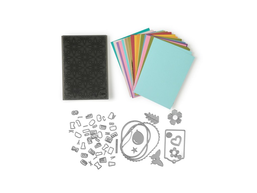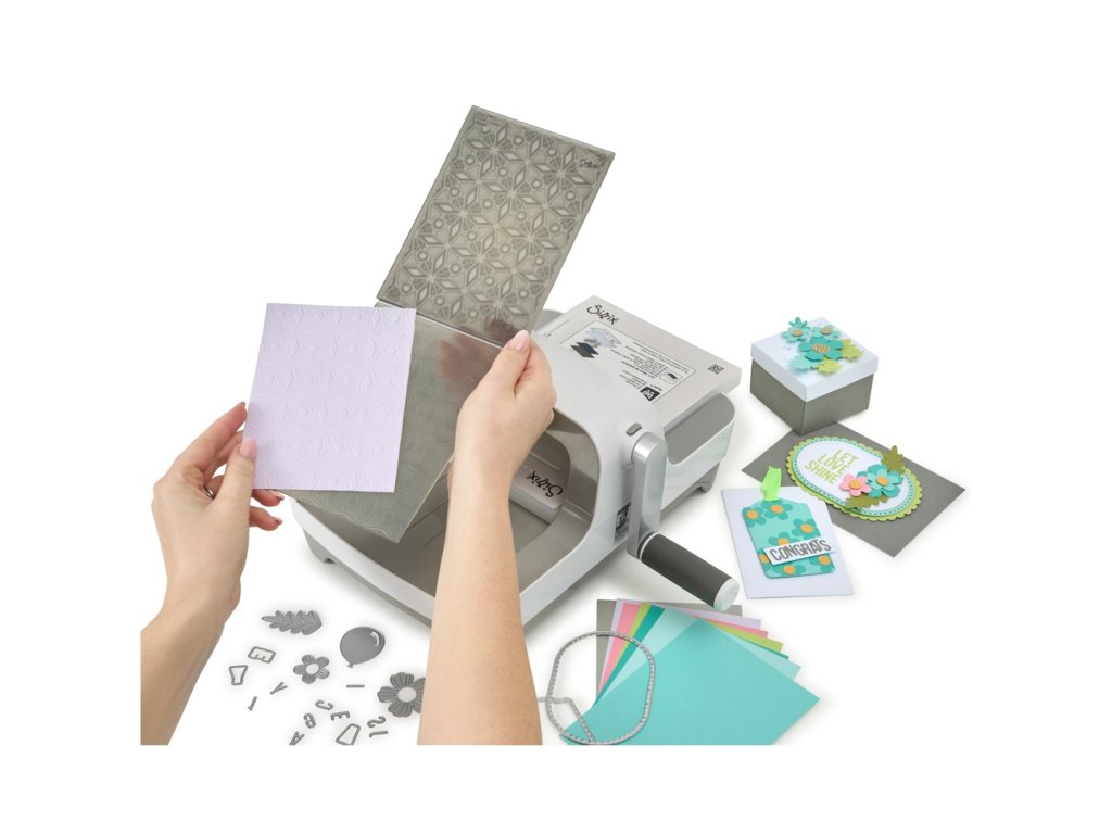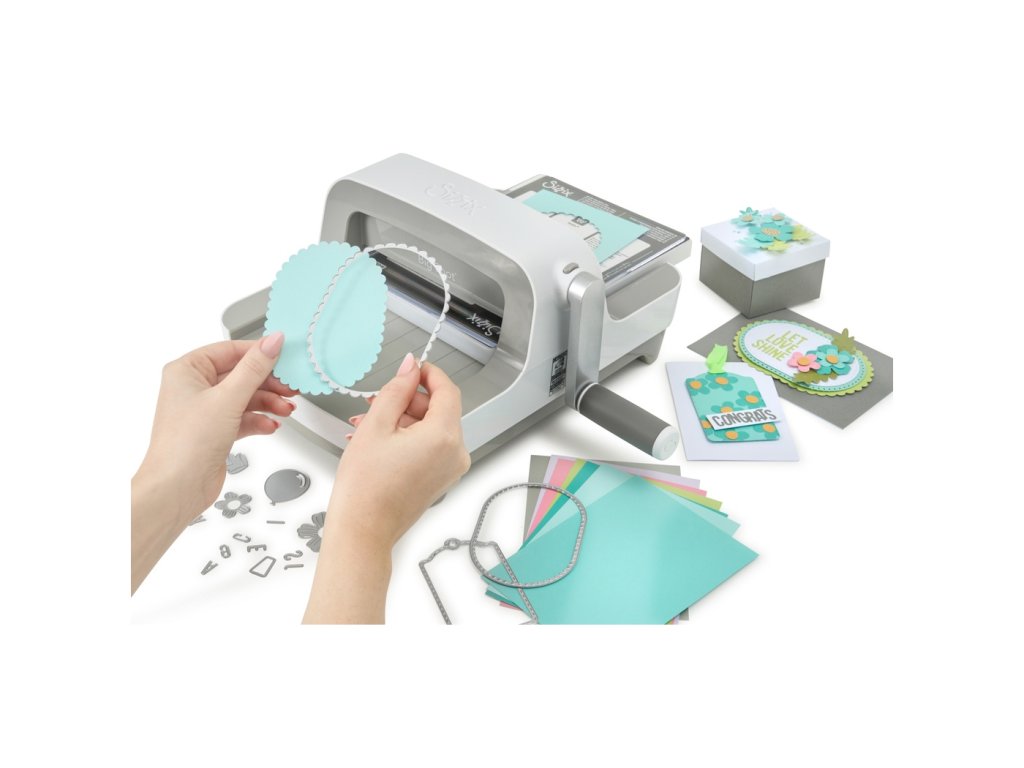 Big Shot je mechanický vyřezávací a embosovací stroj. Sada obsahuje přístroj, základní platformu, tenký adaptér a dvě vyřezávací desky ve standardní krátké verzi.