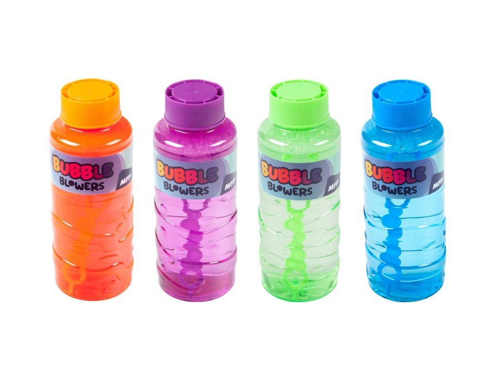 Lahev obsahuje hotovou náplň a praktické foukátko s několika kroužky – stačí otevřít a začít foukat. Dostupná v několika veselých barvách – oranžové, fialové, zelené a modré.