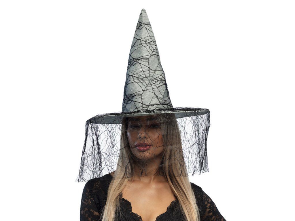 Čarodějnický klobouk se závojem s pavučinou v šedé barvě. Pokud se nespokojíte s obyčejným kloboukem k vašemu čarodějnickému kostýmu, pak tento čarodějnický klobouk je zajímavou volbou.