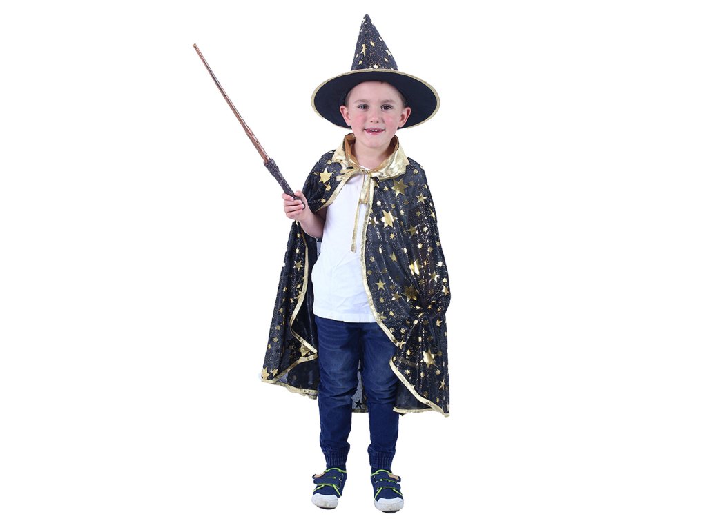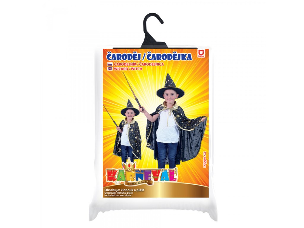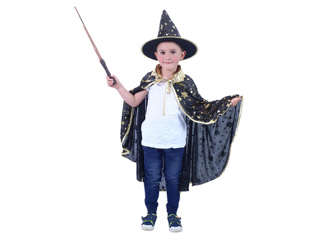 Perfektní souprava pro všechny čarodějnice nebo čaroděje na párty nebo karneval! Balení obsahuje čarodějnický plášť černé barvy se zlatým lemováním a hvězdami a perfektně sladěný klobouk. V těchto exkluzivních doplňcích tě zaručeně nikdo nepřehlédne! Určeno pro děti od 3-7 let. Délka 72 cm.