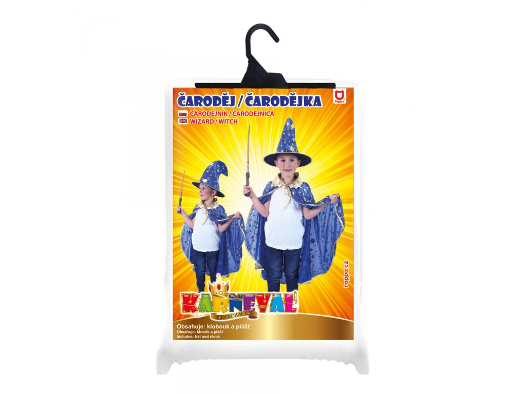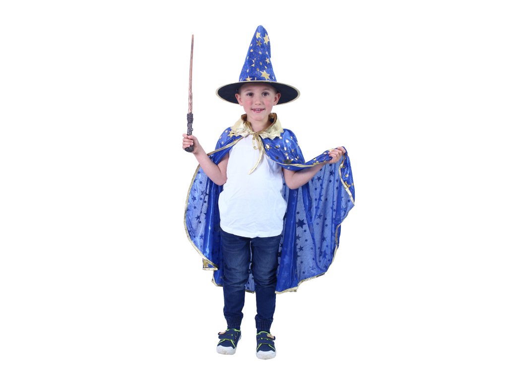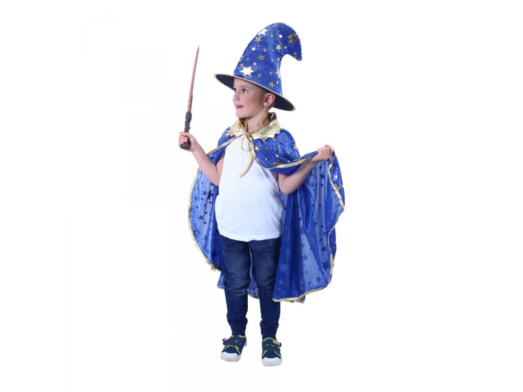 Perfektní souprava pro všechny čarodějnice nebo čaroděje na párty nebo karneval! Balení obsahuje čarodějnický plášť modré barvy se zlatým lemováním a hvězdami a perfektně sladěný klobouk. V těchto exkluzivních doplňcích tě zaručeně nikdo nepřehlédne! Vhodný i na oslavu Halloweenu. Určeno pro děti od 3-8 let.