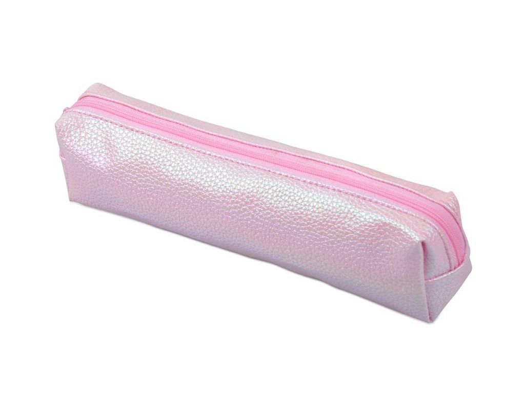 Školní penál/etue mini s perleťovým povrchem v růžové barvě. Povrch penálu se leskne a vytváří efekt měňavého třpytu, který se mění podle úhlu dopadu světla. Zip je růžový, ladící s celkovým designem penálu. Tento úzký, kompaktní penál je vhodný pro uložení několika základních psacích potřeb, jako jsou pera nebo tužky, a díky svému lesklému a elegantnímu vzhledu je atraktivní volbou pro ty, kdo hledají stylový a moderní doplněk do školy či kanceláře.