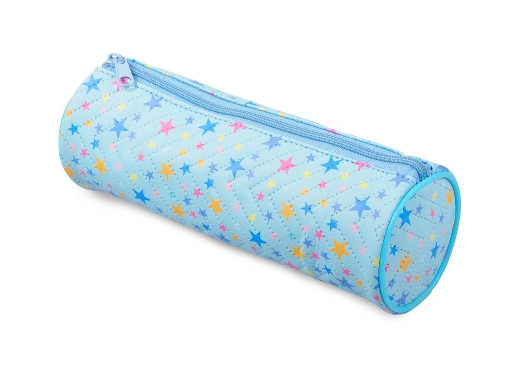 Školní penál/etue válcového tvaru ve světle modré barvě s barevnými hvězdičkami nabízí dostatek prostoru pro vaše tužky, pera, pastelky a další psací potřeby. Je vyrobený z měkkého, prošívaného materiálu. Praktické zapínání na zip zajišťuje, že všechny vaše věci zůstanou bezpečně na svém místě. Díky svému veselému designu se stane oblíbeným společníkem každého školního dne.