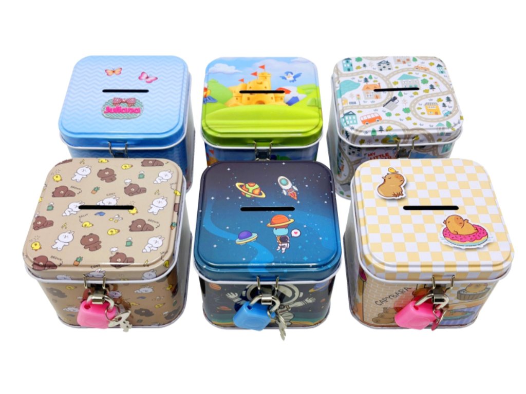 Plechová pokladnička se zámkem, rozměr 8 x 8 x 6,5 cm, mix 6 barev/motivů. Nevhodné pro děti do 3 let.