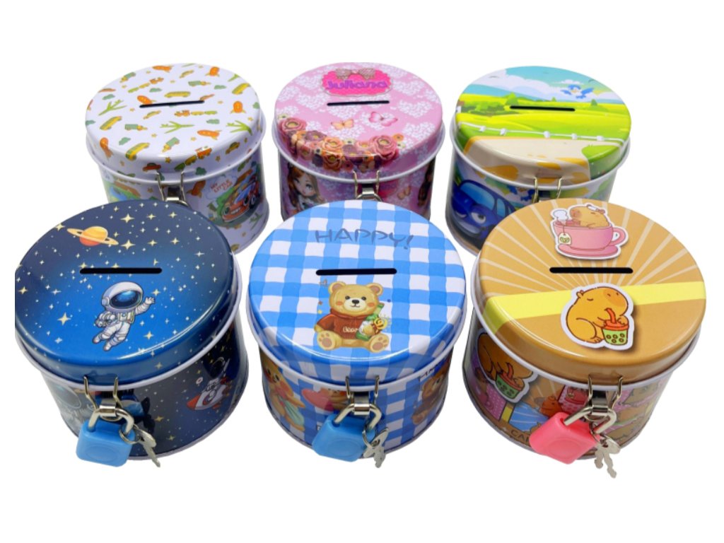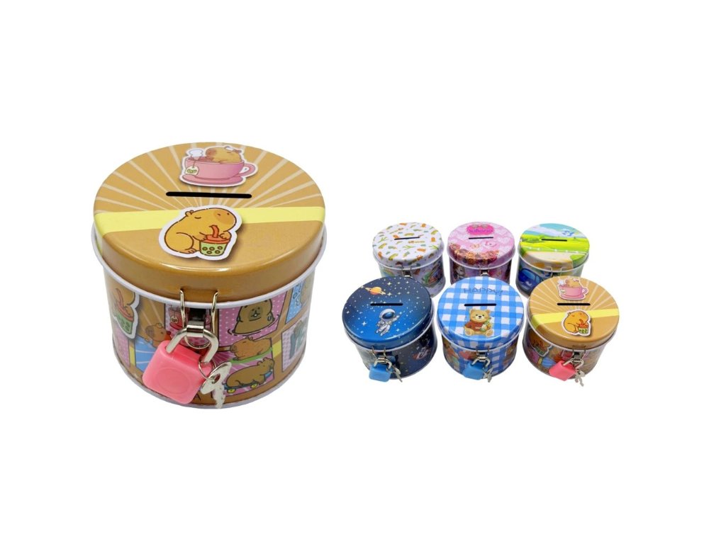 Plechová pokladnička se zámkem, rozměr 8 x 6,5 cm, mix 6 barev/motivů.