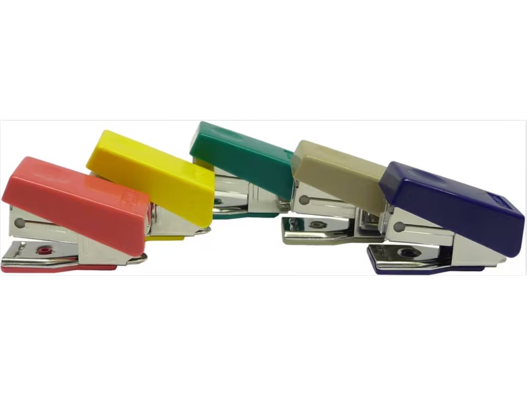 Plastová mini sešívačka s kvalitními ocelovými komponenty, mechanismus pro rychlé doplnění. Barva dodávána dle aktuální skladové zásoby.