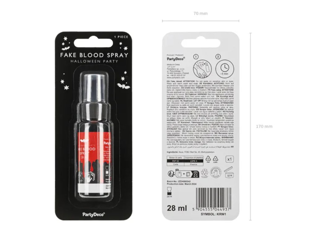 Sprej s motivem falešné krve, objem 28 ml. Ideální pro vytváření halloweenských outfitů s praktickým dávkovačem.