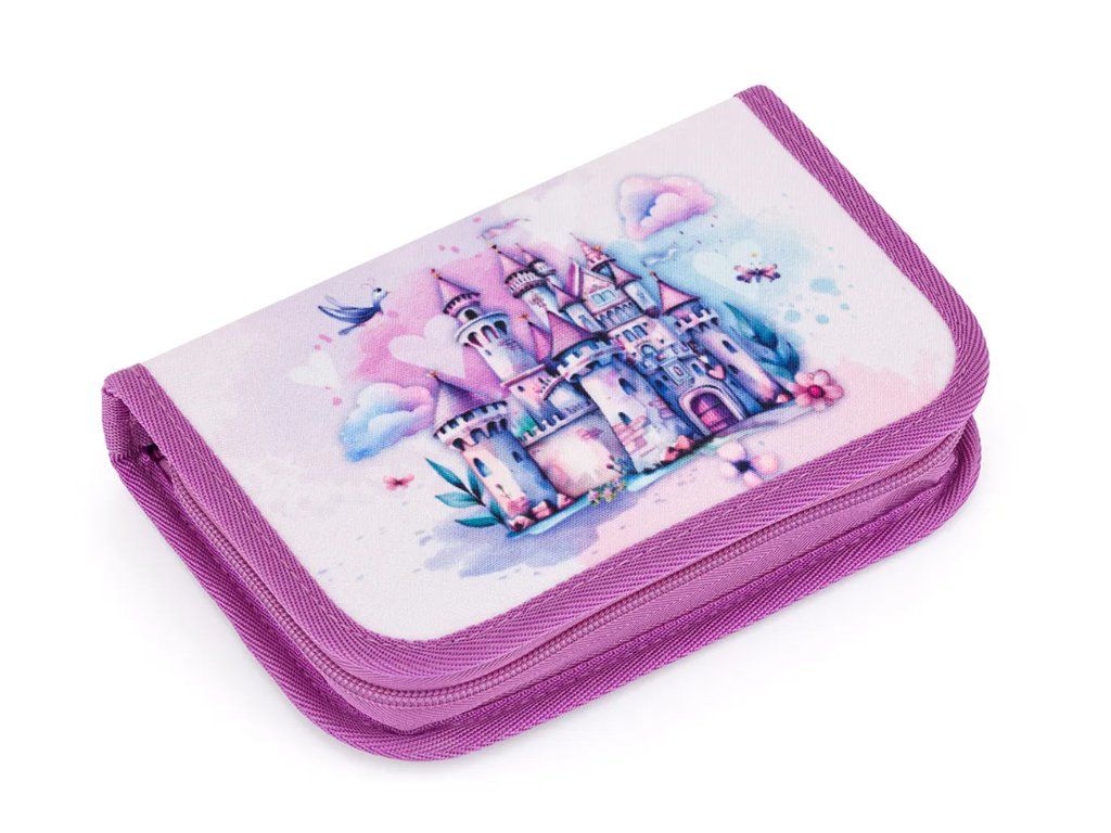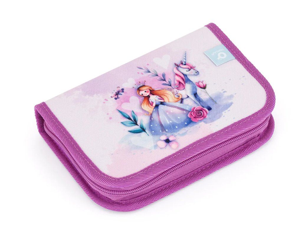 Dvouklopový školní penál PENN 25013 s motivem princezny, jednorožce a kouzelného zámku pojme vše, co vaše školačka potřebuje. 21 gumových poutek spolehlivě udrží pastelky, tužky i fixy na svém místě. Tři širší úchyty jsou připravené na pravítko, kružítko nebo nůžky a dva větší na gumu a ořezávátko.
