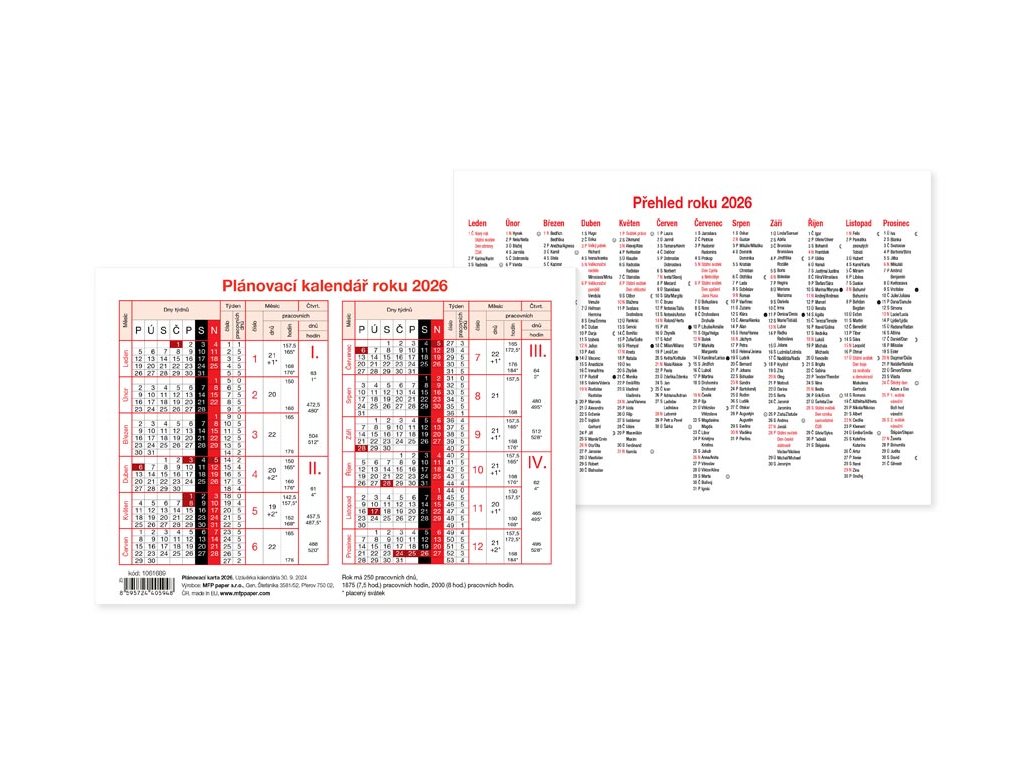 Plánovací karta na rok 2026 ve formátu A5. PLÁNOVACÍ KARTA OBSAHUJE: - názvy měsíců - státní svátky - jmeniny - počet týdnů Rozměr: 21 × 14,8 cm Uvedená cena je za 1 ks.Doplňkové parametry