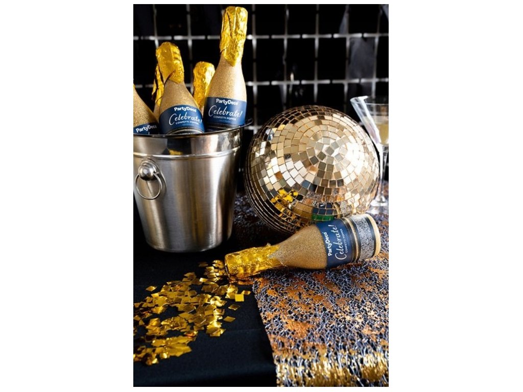 Vystřelovací zlaté konfety ve tvaru lahve šampaňského 20,5 cm Rozjeďte oslavu stylově! Naše vystřelovací konfety ve tvaru luxusní lahve šampaňského jsou perfektním doplňkem na narozeniny, svatby, silvestra i firemní večírky. Stačí otočit, vystřelit a zlatý déšť konfetek rozzáří každou párty. Výška 20,5 cm je ideální pro menší i větší prostory. Efektní, bezpečné a maximálně slavnostní! Tip MojeParty: Přidejte k lahvi tematické dekorace a balónky ve stříbrné barvě a vytvořte nezapomenutelnou atmosféru.