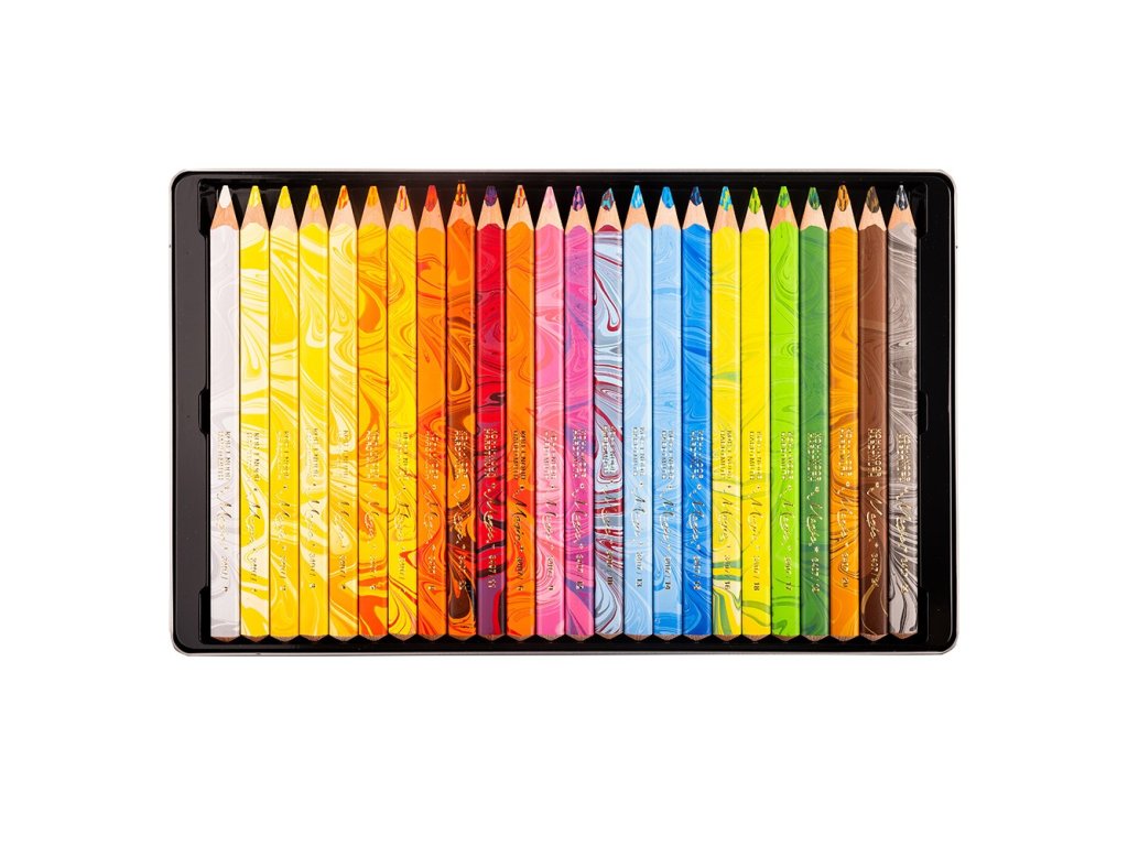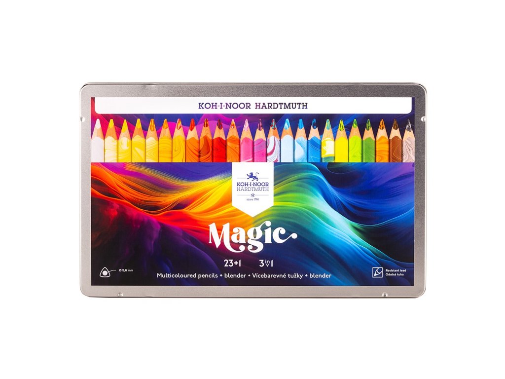 Úžasné trojhranné pastelové tužky MAGIC TR 10,4 mm v dřevěném plášti z certifikovaného dřeva FSC 100% se speciálním vysoce kvalitním tříbarevným jádrem – 3 odstíny barvy v jedné tuze. 24 ks souprava včetně míchací tužky v plechové krabičce.Ergonomický trojhranný tvar umožňuje optimální držení a vedení tužky. Tužka vytváří vícebarevnou stopu, která se mění natočením hrotu. Jedinečná pro vybarvení větších ploch, na které se má střídat více blízkých odstínů např. tráva, moře atd. Pro dosažení barevného efektu za použití různých technik kreseb /stínování, šrafování/ je výsledný efekt kresby plastičtější než u kresby klasickou pastelkou.