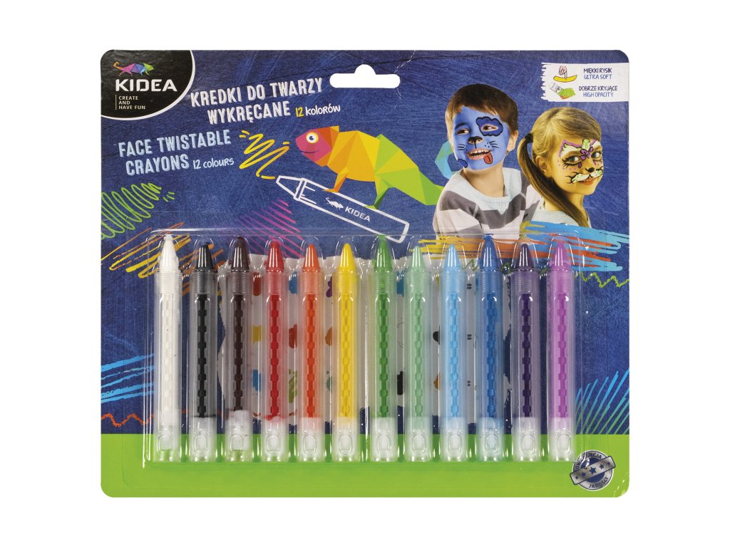 Obličejové tužky ve dvanácti výrazných barvách, které se díky své jemnosti skvěle hodí k preciznímu kreslení kreativních kreseb na kůži. Jejich pohodlný otočný mechanismus činí produkt ještě atraktivnějším a umožňuje pohodlné použití. Použití tužek je bezpečné, což potvrzují dermatologické testy. Mají ergonomický tvar, takže skvěle padnou do ruky každého dítěte. V balení 12 barev