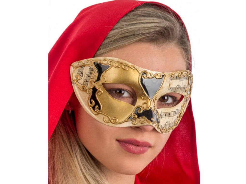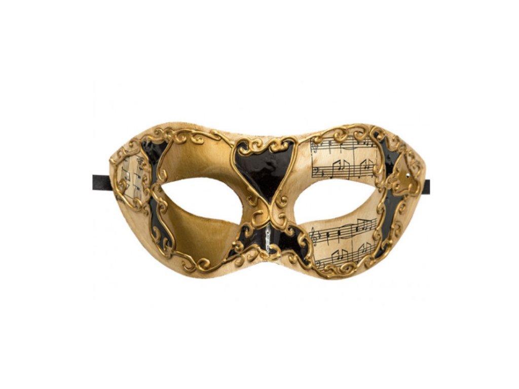 se zlatými a černými dekoracemi s motivem not. Vhodné na maškarní plesy ve stylu benátského karnevalu.