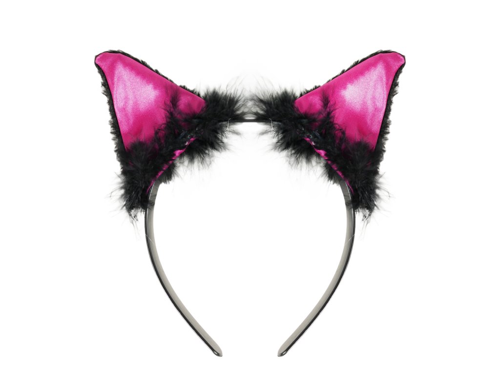 Karnevalová čelenka s kočičíma ušima růžovo-černé barvy a peřím je perfektním doplňkem ke kostýmu kočky.