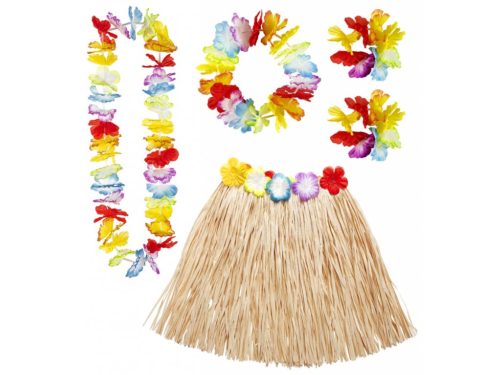 Havajský komplet, havajská sukně s květy, věnec, čelenka, 2 náramky. Přírodní vzhled.