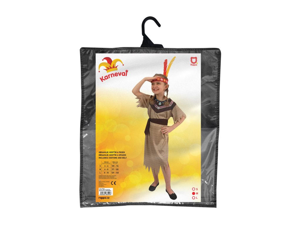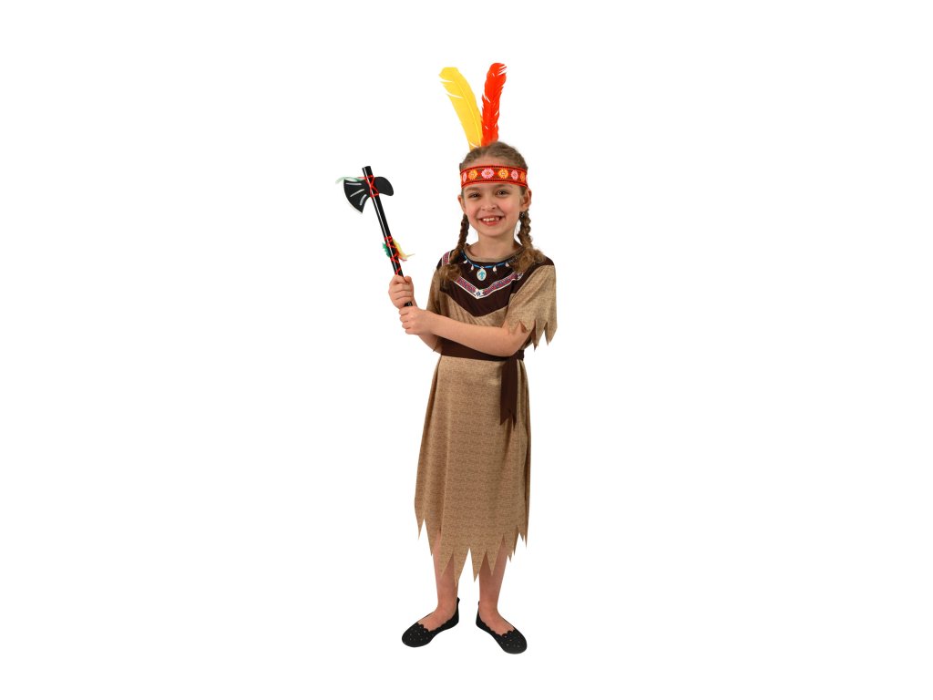 Stylový karnevalový kostým v motivu indiánské slečny! Kostým hnědé barvy ve velikosti M je určen pro děvčata ve věkovém rozmezí 6-8 let (117-128cm). Staň se největší hvězdou karnevalu! Sekera ani čelenka nejsou součástí balení.