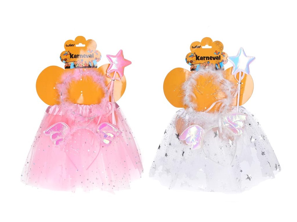 Krásná sada na karneval pro princezny Andělky. Set obsahuje sukýnku, čelenku s křidélky a svatozáří a hůlku s hvězdou.