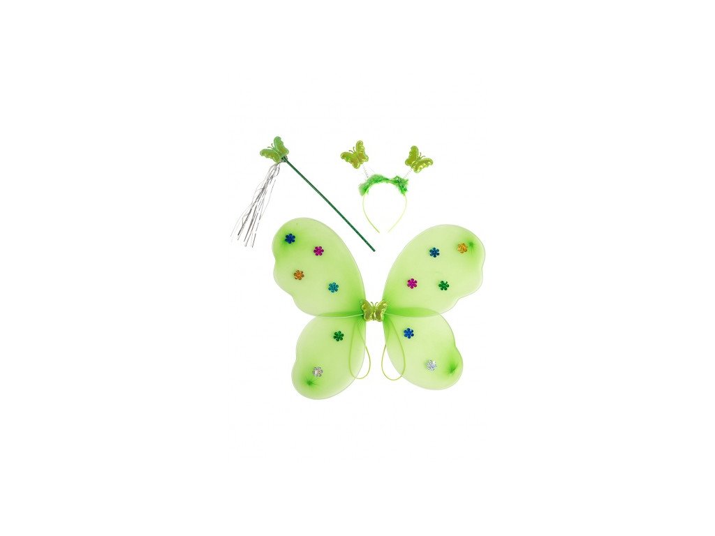 Zelená sada motýl sestávající z křídel, čelenky a hůlky. Pro okouzlující karnevalový převlek nebo pro každodenní hru