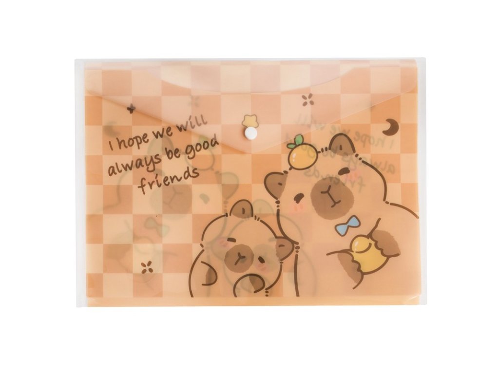 Tato praktická složka A4 s praktickým zapínáním na patent je ideální pro ukládání dokumentů. Zdobená okouzlujícím béžovým motivem kapybary je ideální do školy, kanceláře nebo domů.