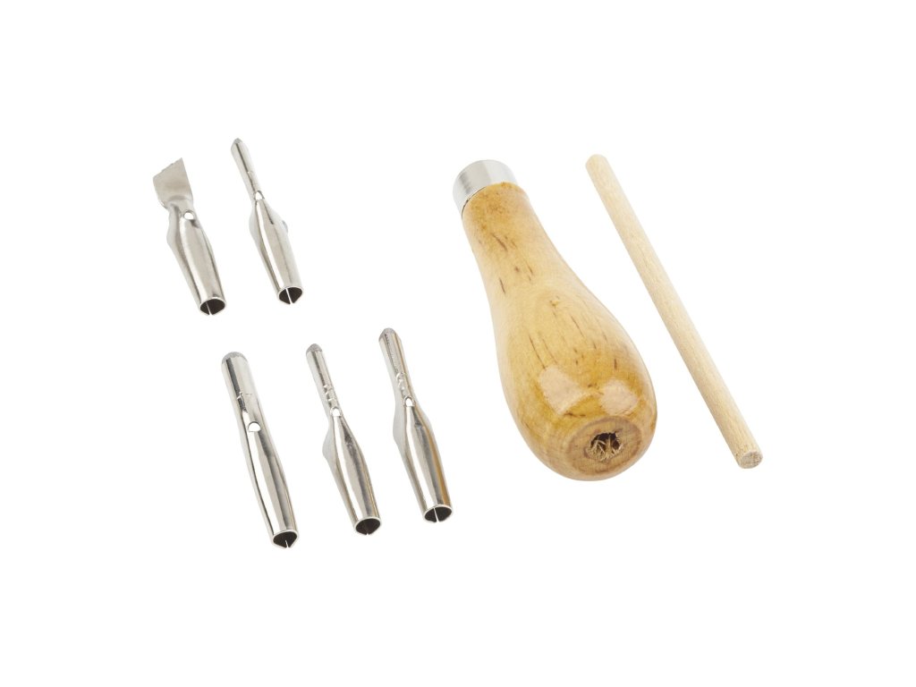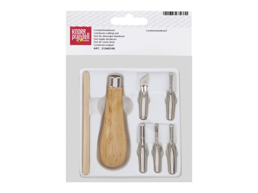 Sada dřevěná rukojeť a 5 různých výměnných hlav + dřevěná tyčinka - pomůcka k nasazení nástavce na rukojeť. Fotonávod na zadní straně obalu. Pro snadnou výměnu čepelí zatlačte dřevěnou tyčkou ze spodní části rukojeti tak, aby se nástroj uvolnil. Rydla vhodná pro linoryt na práci s linem (linoleum). Sada obsahuje rydlo na linoryt.