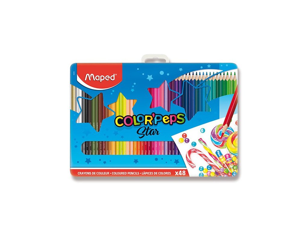 Sadu 48 kusů pastelek v odolném kovovém pouzdře s veselým designem využije každý školák. Pouzdro je odolné proti nárazům, chrání pastelky proti poškození. Ergonomické pastelky Maped ColorPeps mají trojhranné tělo, měkkou odolnou tuhu a jasné barvy.