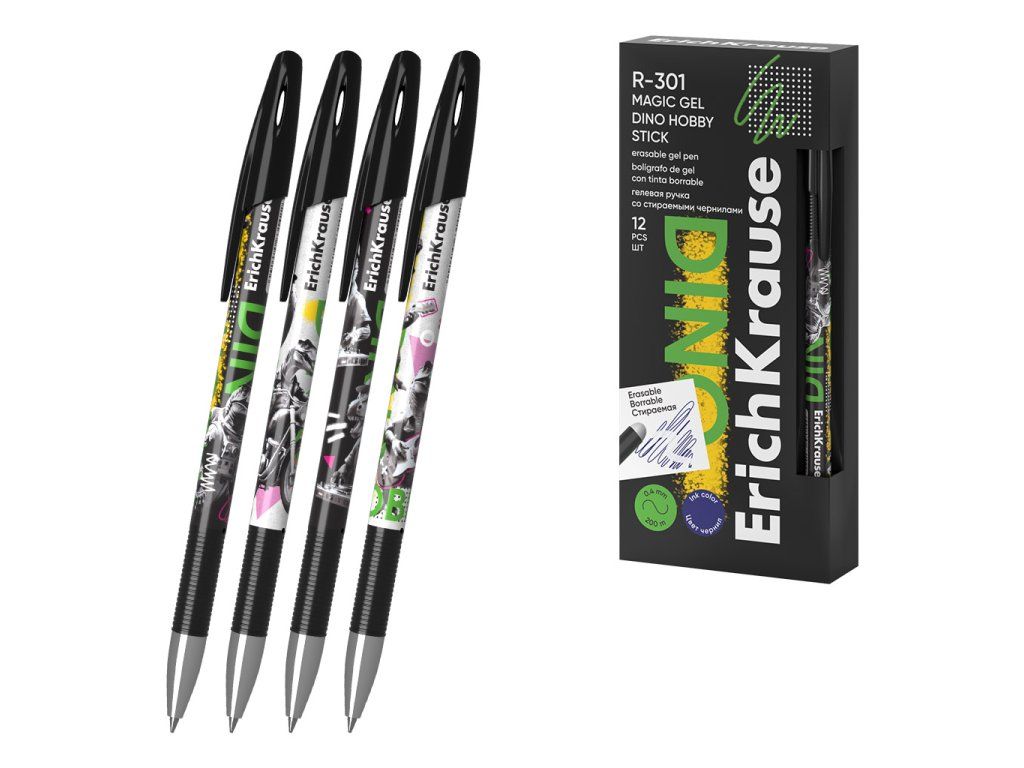 Jednorázové mazací gelové pero s víčkem a standardním typem hrotu. Pero má neprůhledné kulaté tělo s designem Dino Hobby, pohodlný vroubkovaný úchop a gumu na konci těla. Průměr kuličky 0,5 mm v kombinaci s rychleschnoucím gelovým inkoustem poskytuje snadné, přesné a rychlé psaní. délka stopy 200 m, šíře stopy 0,4 mm.