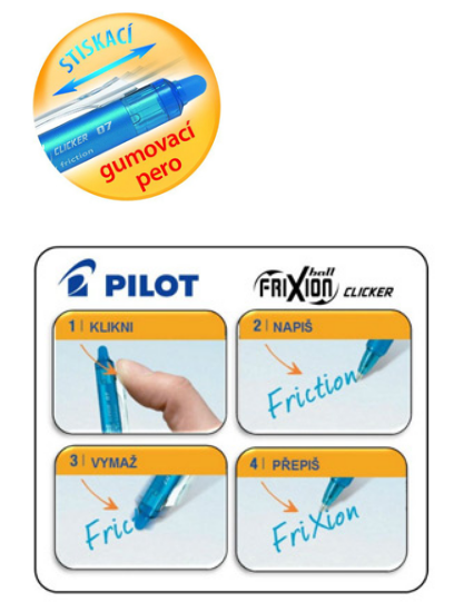 Přepisovatelný roller s tekutou náplní od předního japonského výrobce Pilot. Speciální inkoust - napsaný text lze vymazat a znovu přepsat na tomtéž místě. Text zneviditelníte zahřátím na 65 °C, které vznikne třením ("gumování") plastového zakončení rolleru na papíře. Znovu se objeví při teplotě nižší než -15 °C. FriXion je ideální výrobek určený nejen pro školáky.