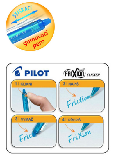 Přepisovatelný roller s tekutou náplní od předního japonského výrobce Pilot. Speciální inkoust - napsaný text lze vymazat a znovu přepsat na tomtéž místě. Text zneviditelníte zahřátím na 65 °C, které vznikne třením ("gumování") plastového zakončení rolleru na papíře. Znovu se objeví při teplotě nižší než -15 °C. FriXion je ideální výrobek určený nejen pro školáky.