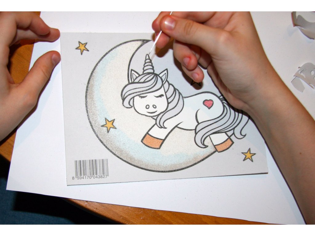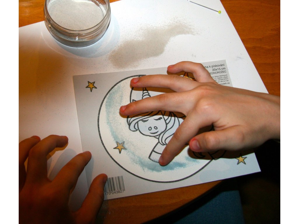 Ofsetem předtištěná předloha k pískování na kvalitní samolepce. Tištěné čáry jsou již z výroby prořezané, ke tvoření tedy není potřeba nic jiného než trocha zručnosti, špendlík a barevné písky, které NEJSOU součástí samostatných předloh. Písky si můžete vybrat zvlášť.