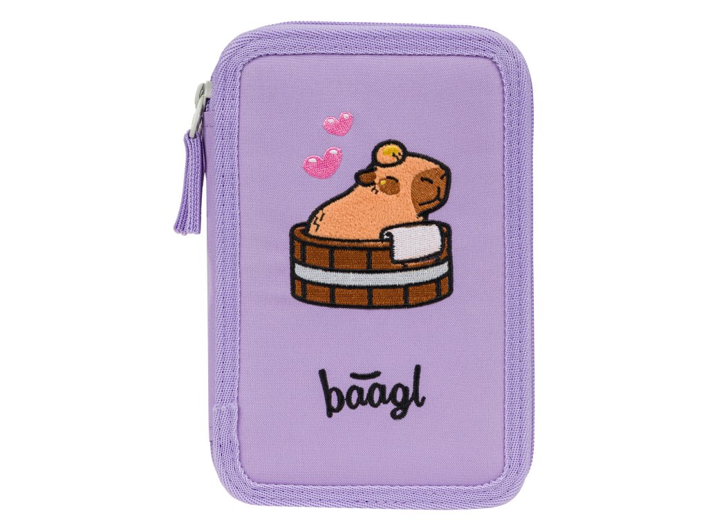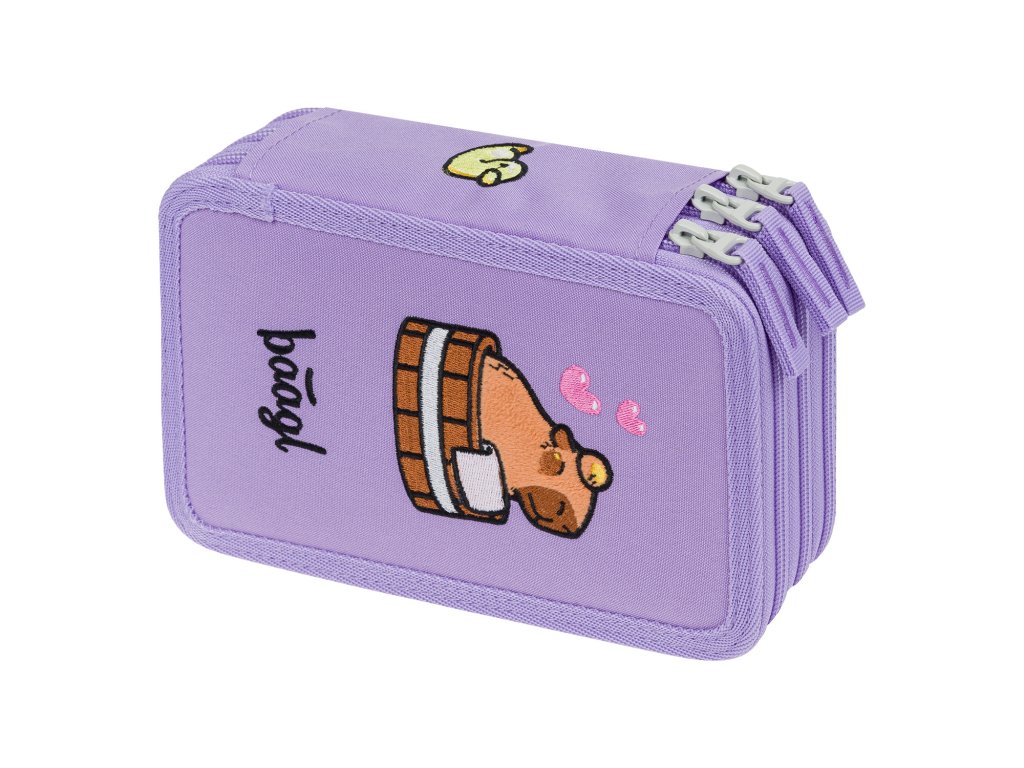 Prostorný penál etue s jemným motivem lístků a logem BAAGL. Součástí penálu je hlavní kapsa a výklopná kapsička s přepážkou a gumičkami na tužky a jiné psací potřeby.