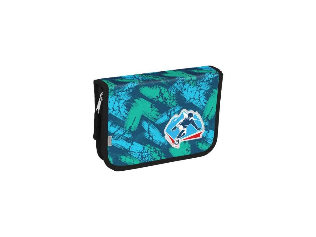 Jednopatrový penál se dvěma chlopěmi pro uložení školních potřeb.