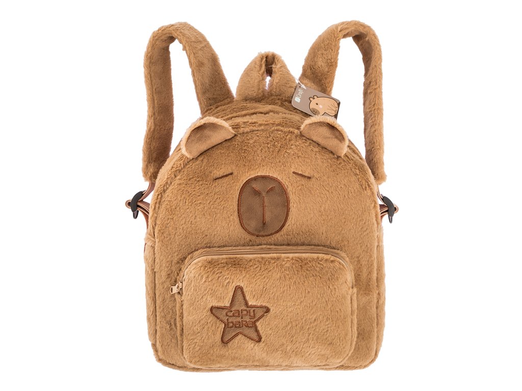 Plyšový batoh s motivem kapybary o rozměrech 28 x 25 x 11 cm. Měkký a příjemný na dotek, ideální pro děti a milovníky roztomilých doplňků. Má nastavitelné popruhy, jednu velkou přihrádku a jednu menší kapsu na drobnosti.