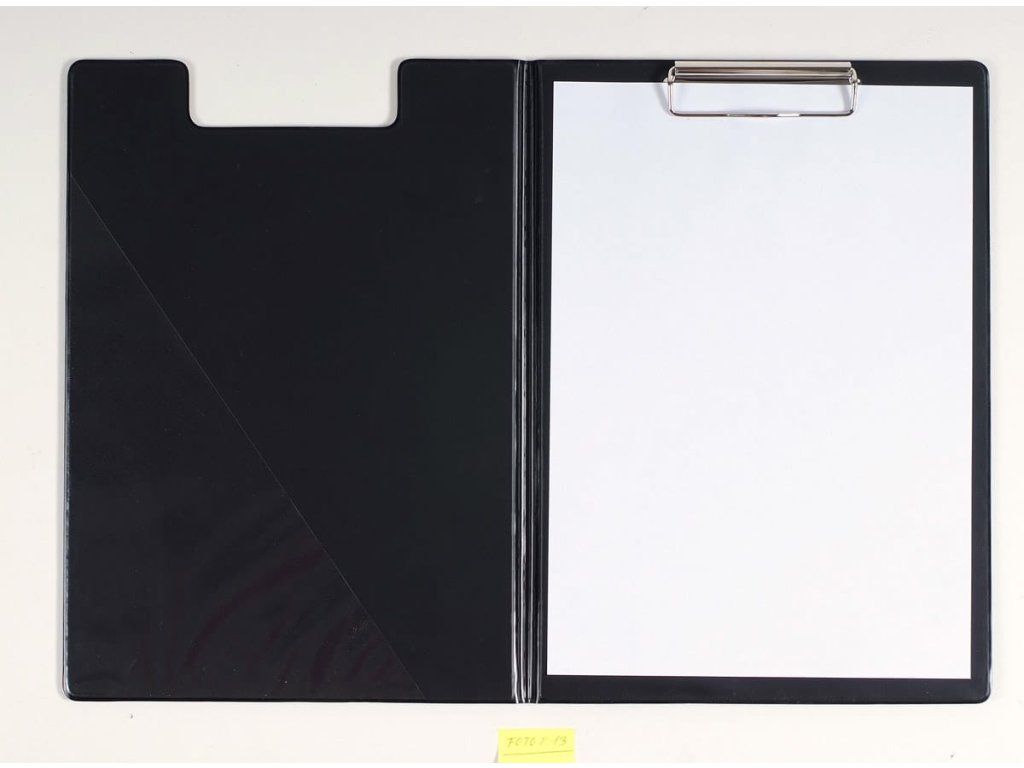 Uzavíratelná psací podložka s kovovým klipem, vyrobena z extra pevné lepenky. Vnitřní průhledná kapsa