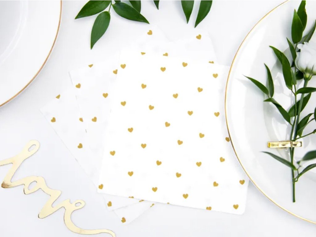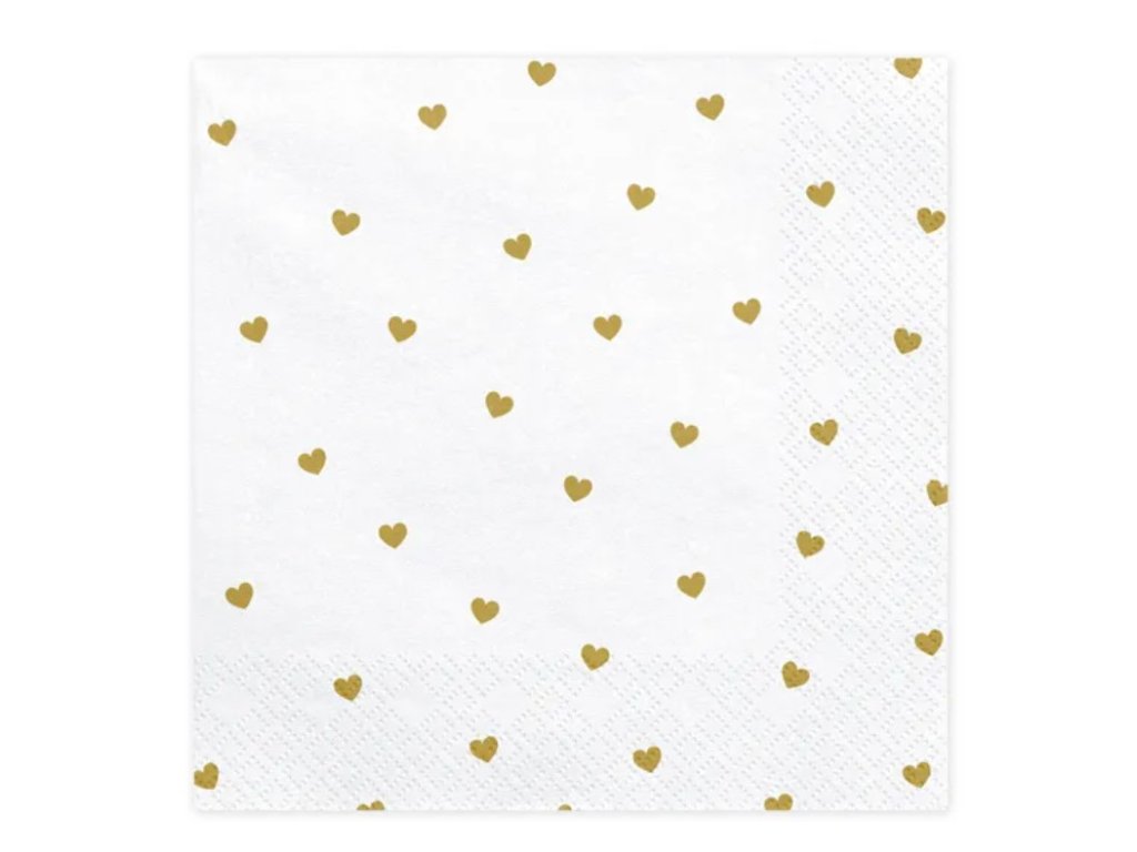 Papírové ubrousky Hearts, bílé se zlatým potiskem, velikost po rozložení cca. 33 x 33 cm, rozměr po sestavení cca. 16,5 x 16,5 cm. V balení 20 kusů.