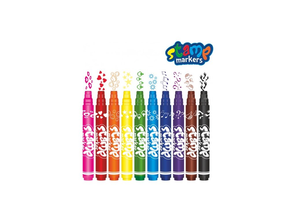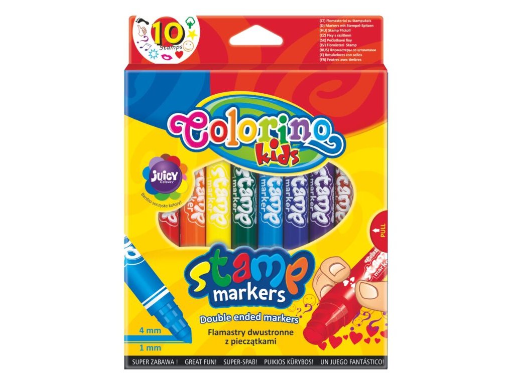 Oboustranné fixy. Z jedné strany kuželovitý hrot pro kreslení a psaní, z druhé razítko. 10 šťavnatých barev - 10 různých razítek. Ideální pro zdobení pozvánek, přání a tvoření. V balení 10ks.