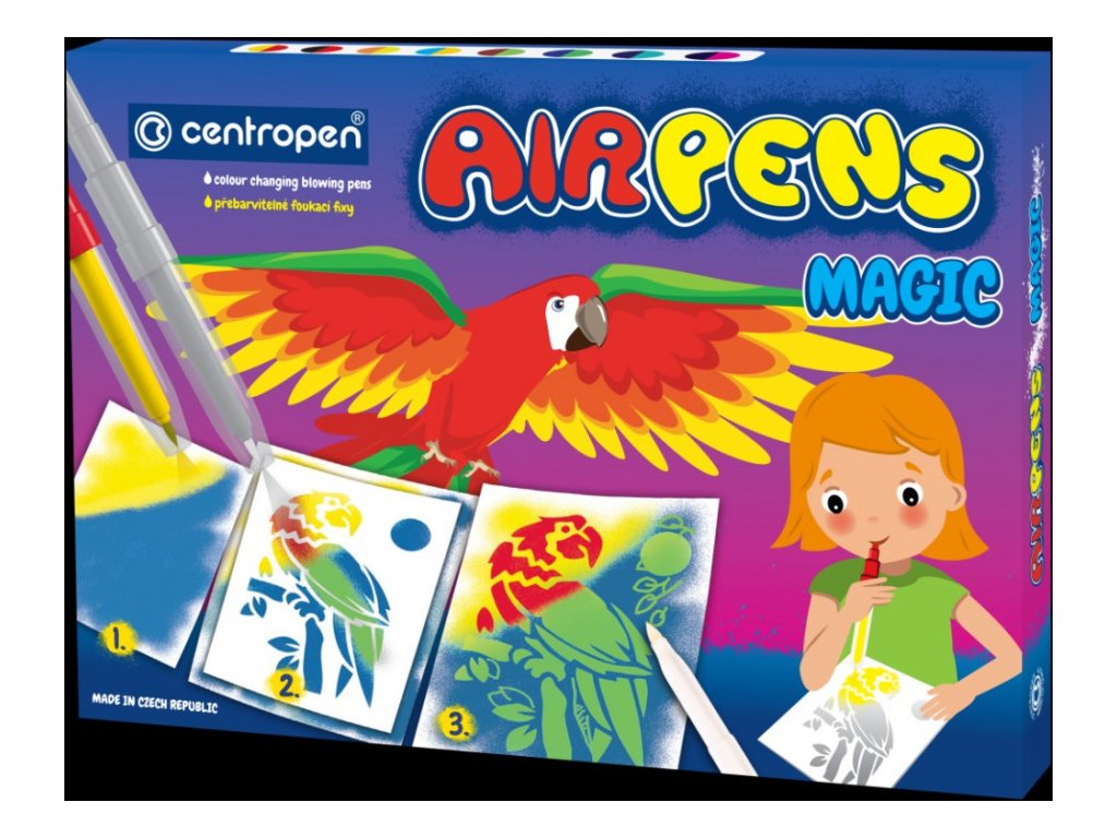 Sada magických foukacích fixů s vnitřní náplní, které jsou určeny na papír. Náplně obsahují zdravotně nezávadný inkoust přebarvitelný zmizíkem.