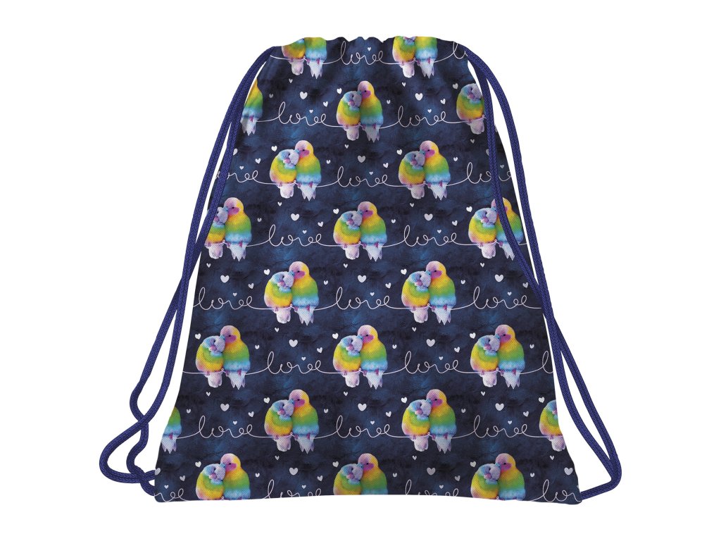 Vícebarevné andulky, sjednoceni silným, láskyplným poutem, se hnízdí na tmavě modrém pozadí. Romantická a barevná – přesně taková je taška na boty BackUP z kolekce Love! Kombinace zářivě zelené, fialové a tmavě modré vytváří jedinečnou a radostnou kompozici. Tato taška na tělocvik je pro dívku, jejíž láska inspiruje vše krásné! Taška BackUP: