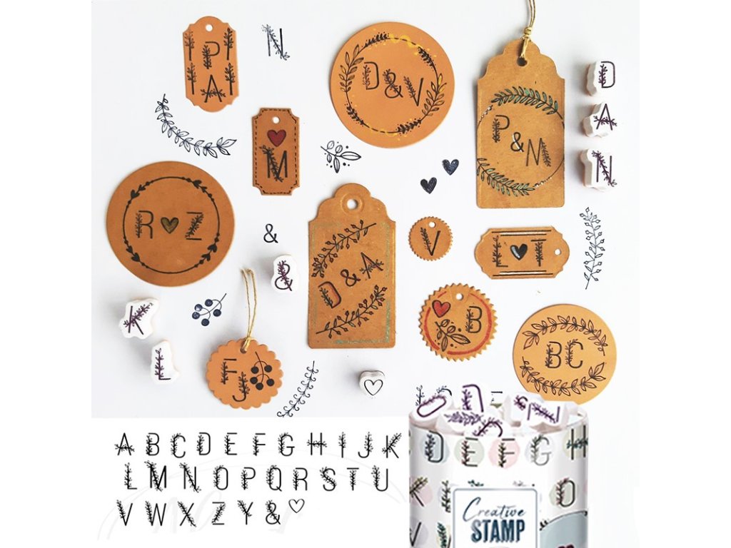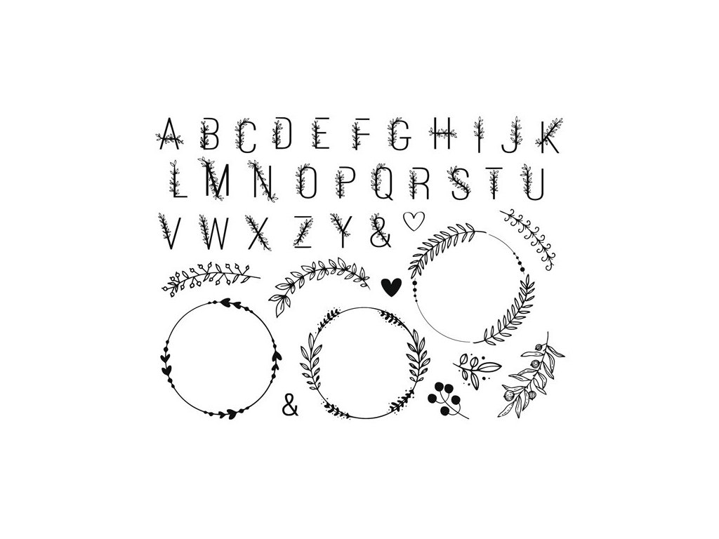 Originální sada gumových razítek - romantická abeceda a věnečky pro krásná přání, svatební oznámení a další vyrábění. Sada obsahuje 39 razítek a razítkovací poštářek černé barvy.